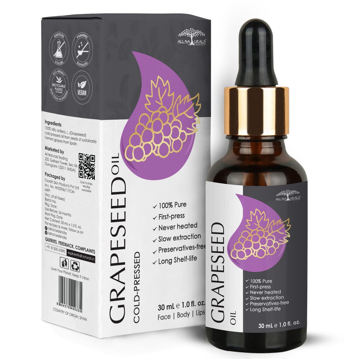 ACNE OILY-SKIN EXPERT: With its extremely low comedogenic index value of 1, Grapeseed Oil is known to work very well on oily and acne-prone skin. In fact, continuous use of this oil helps to balance the oil content in the skin gradually, reducing chances of recurrence of acne. 2 drops Tea Tree, 1 drop each of Rosemary Lavender in a tablespoon for Grapeseed make for a great anti-acne recipe. INSTANT GLOW FACE OIL: Need instant glow moisturization, look no further. Grapeseed Oil is an excellent moisturizer and can easily replace your expensive lotions and creams to give you an instant glow (not oiliness). Add 2 drops helichrysum and 1 drop neroli essential oil to a tablespoon of Grapeseed and apply 3-4 times a week to get a never before glow and reduced pigmentation in just a few applications. ALL ROUNDER FACE, BODY HAIR OIL: High values of Linoleic Oleic Acids make Grapeseed oil great notjust for your face but also the rest of the body and hair. It makes lips, nails, elbows, knees super soft, and, nourishes the scalp to reduce dandruff itchiness and support hair growth. Did you know a few drops of grapeseed oil on a cotton pad work as a perfect make-up remover. Add 4 drops Rosemary Oil in Grapeseed to tighten JUDGING AUTHENTIC GRAPESEED OIL: Important to note is the color and odor of the grapeseed oil. The color should be slightly yellow with a greenish tinge. Darker than yellow color means higher citrus pulp content which leads to a stronger odor, chances of quick rancidity and lower potency. A very slight fruity odor is a marker for a good quality grapeseed oil. COLOR, CONSISTENCY, ODOR: All Naturals Grapeseed Oil is the right color consistency and is almost odorless due to the highly advanced pitting process to remove the maximum amount of pulp without involving any heat, giving it a longer shelf life of two years. NET CONTENTS: 30 mL, COUNTRY OF ORIGIN: SpainJUDGING AUTHENTIC GRAPESEED OIL: Important to note is the color and odor of the grapeseed oil. The color should be slightly yellow with a greenish tinge. Darker than yellow color means higher citrus pulp content which leads to a stronger odor, chances of quick rancidity and lower potency. A very slight fruity odor is a marker for a good quality grapeseed oil. COLOR, CONSISTENCY, ODOR: All Naturals Grapeseed Oil is the right color consistency and is almost odorless due to the highly advanced pitting process to remove the maximum amount of pulp without involving any heat, giving it a longer shelf life of up to two years. NET CONTENTS: 30 mL, COUNTRY OF ORIGIN: Spain. ALL ROUNDER FACE, BODY HAIR OIL: Owing to high values of Linoleic and Oleic Acids, Grapeseed oil is not only great for your face but the rest of the body and your hair as well. It makes lips, nails, elbows, knees super soft, and, nourishes the scalp to reduce dandruff itchiness and support hair growth. Did you know a few drops of grapeseed oil on a cotton pad work as a perfect make-up remover. Add 4 drops Rosemary Oil in Grapeseed to tighten tone the skin. INSTANT GLOW FACE OIL: Need instant glow moisturization, look no further. Grapeseed Oil is an excellent moisturizer and can easily replace your expensive lotions and creams to give you an instant glow (not oiliness). Add 2 drops helichrysum and 1 drop neroli essential oil to a tablespoon of Grapeseed and apply 3-4 times a week to get a never before glow and reduced pigmentation in just a few applications. ACNE OILY-SKIN EXPERT: With its extremely low comedogenic index value of 1, Grapeseed Oil is known to work very well on oily and acne-prone skin. In fact, continuous use of this oil helps to balance the oil content in the skin gradually, reducing chances of recurrence of acne. 2 drops Tea Tree, 1 drop each of Rosemary Lavender in a tablespoon for Grapeseed make for a great anti-acne recipe.