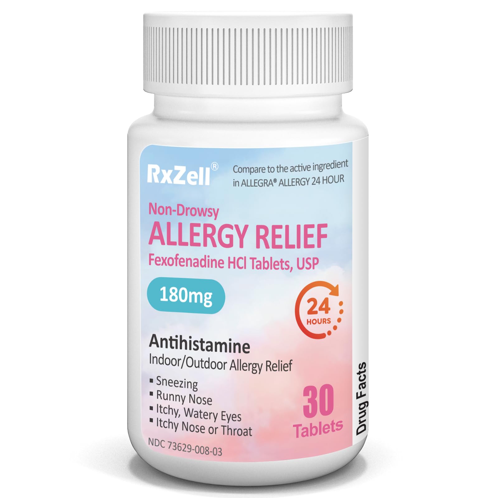 Child and Adult - 1 small tablet daily for adults and children 12 years and over. Please refer to the label for special conditions and ask a pharmacist or doctor for more information. Fast Last - A RxZell Allergy Relief tablet help restore clarity fast and can provide up to 24 hours of allergy relief, so you can get ready and focus on enjoying. Non-Drowsy Formula – provide full strength allergy relief without disturbing daily activities. Multi-symptom Relief – Reliefs common allergy reaction including sneezing, runny nose, itchy, watery eyes, and itchy nose or throat, to various cause like pollen, dust mites, pet dander, and mold. ACTIVE INGREDIENT - RxZell Fexofenadine HCl 180mg Allergy Relief contains Fexofenadine Hydrochloride 180mg per tablet. A non-drowsy antihistamine that helps reliefs from allergy symptoms without the daytime sleepiness.