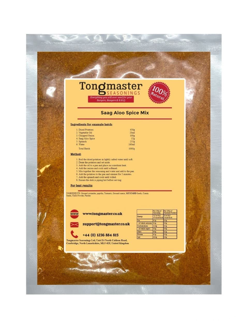 Use 15g of spice for every 450g of potatoes. Add spinach and cook until wilted, serve piping hot. Add the potatoes an simmer for 5 minutes. Soften onions in a pan with oil, Mix the seasoning with water and add to the pan. Boil the diced potatoes in lightly salted water until soft, drain and set aside. Ideal for creating the traditional Asian side dish containing potatoes, spinach and onions. A traditional blend of spices such as turmeric, paprika and cumin.