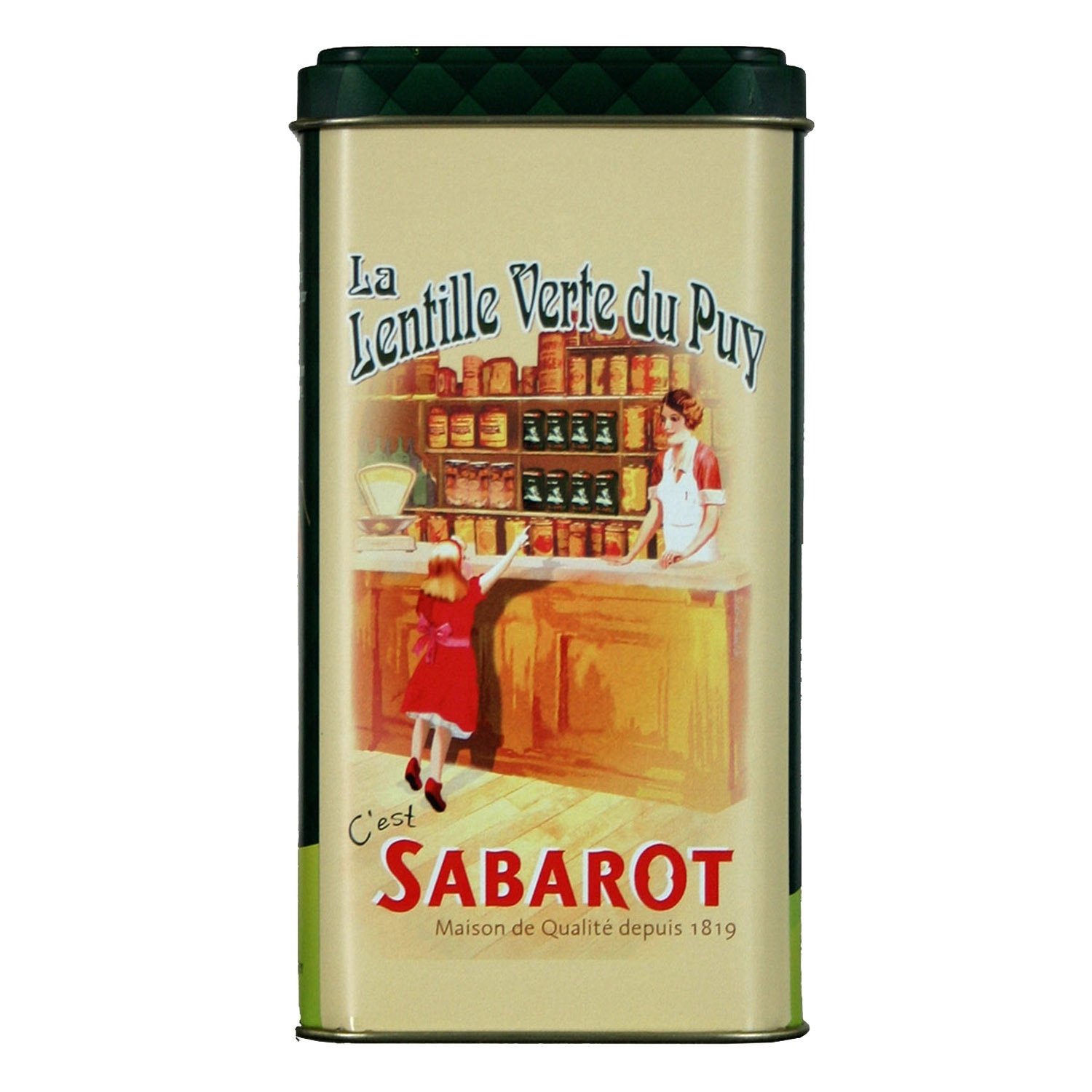 : 500g Metal Tin of Puy Green Lentils AOP. Formerly AOC and now AOP, Puy Green Lentils are grown using environmentally friendly farming practices. With their incomparable taste, they are recognized worldwide by top chefs. They can be used in salads or as a hot dish with meat or fish. You can even try them in a dessert. Ingredients: Puy Green Lentils. May contain traces of cereals containing gluten. Information in bold is for people with intolerances or allergies. Cooking Instructions: Soak the lentils in three times their volume of cold water. Cook them over low heat for about 20 minutes after boiling. This package contains approximately 6 servings of 80g each. Average nutritional values ??per 100g of dry product: Energy: 1377 kJ (326 kcal) Fat: 1.3g of which saturates: 0.2g Carbohydrate: 45g of which sugars: 1g Fiber: 14g Protein: 26.5g Salt: 0.01g. Discover the quality and expertise of SABAROT products at www.sabarot.com. Instructions: Soak the lentils in three times their volume of cold water. Cook them over low heat for about 20 minutes after boiling.Metal box. Lenses.Description du produit Boîte Collection métal de Lentille verte du Puy A.O.P. 500g Anciennement AOC et maintenant AOP, la Lentille verte du Puy est issue d'une agriculture respectueuse de l'environnement. Au goût incomparable, elle est reconnue dans le monde par les plus grands chefs. Elle se cuisine aussi bien en salade qu'en plat chaud avec de la viande ou du poisson. Vous pouvez même l'essayer en dessert. Ingrédients : Lentilles vertes du Puy Présence possible de céréales contenant du gluten. Les informations en gras sont destinées aux personnes intolérantes ou allergiques. Conseils de préparation : Plongez les lentilles dans dans trois fois leur volume deau froide. Faites-les cuire à feu doux pendant environ 20 minutes à partir de lébullition. Ce paquet contient environ 6 portions de 80g. Valeurs nutritionnelles moyennes pour 100g de produit sec : Énergie : 1 377 kJ (326 kcal) Matières grasses : 1.3g dont Acides gras saturés : 0.2g Glucides : 45g dont Sucres : 1g Fibres alimentaires : 14g Protéines : 26.5g Sel : 0.01g Retrouvez toute la qualité et le savoir-faire des produits SABAROT sur www.sabarot.com Mode d'emploi Faire tremper les lentilles dans trois fois leur volume d'eau froide. Les faire cuire à feu doux pendant environ 20 minutes après l'ébullition.Boîte métal. Lentilles.Sabarot - Boîte Collection Lentille verte du Puy A.O.P. 500g