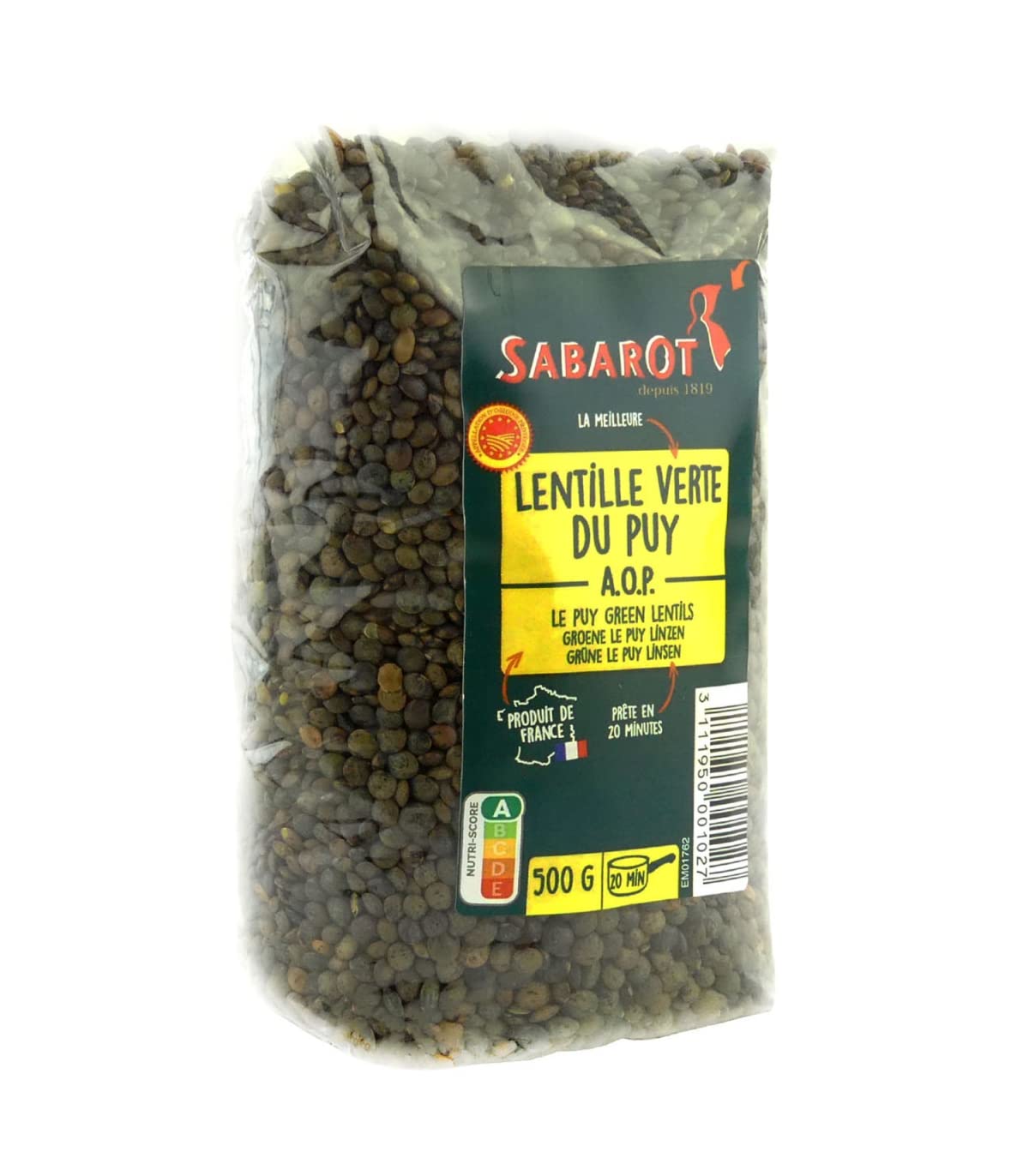 : Puy Green Lentils A.O.P. 500g SABAROT. Formerly A.O.C. and now A.O.P., Puy Green Lentils are grown using environmentally friendly farming practices. With an incomparable taste, recognized worldwide by top chefs, this product from the Haute-Loire region benefits from the microclimate of the volcanic soils of Velay. Its flavor and texture (firm when cooked) are due to the terroir of Haute-Loire. Enjoy them in salads, with salted meats, fish, or even as a dessert. Ingredients: Puy Green Lentils. May contain traces of cereals containing gluten. Cooking Instructions: Soak the lentils in three times their volume of cold water. Cook for approximately 20 minutes after boiling. Add salt to the lentils only at the end. This package contains 6 portions of 80g each. Average nutritional values ??per 100g of dry product: Energy: 1377 kJ (326 kcal) Fat: 1.3g of which Saturates: 0.2g Carbohydrate: 45g of which Sugars: 1g Fiber: 14g Protein: 26.5g Salt: 0.01g Discover all the quality and expertise of SABAROT products and consult our recipes on www.sabarot.com Ingredients Puy Green Lentils 500g P.when('A').execute(function(A) { A.on('a:expander:toggle_description:toggle:collapse', function(data) { window.scroll(0, data.expander. expander[0].offsetTop-100) }) }) Instructions for use Soak the lentils in three times their volume of cold water. Cook for about 20 minutes after boiling. Only salt the lentils at the end. See moreSachet. Lenses.Description du produit Lentilles vertes du Puy A.O.P. 500g SABAROT Anciennement A.O.C et maintenant A.O.P., la Lentille verte du Puy est issue d'une agriculture respectueuse de la nature. Au goût incomparable et reconnu dans le monde par les plus grands chefs, ce produit altiligérien bénéficie du microclimat des terres volcaniques du Velay. Son goût et sa texture (ferme en cuisson) sont obtenus grâce au terroir de Haute Loire. N'hésitez pas à la cuisiner en salade, avec un petit salé, du poisson, ou même en dessert. Ingrédients : Lentilles vertes du Puy Présence possible de céréales contenant du gluten. Conseils de préparation : Plongez les lentilles dans trois fois leur volume deau froide. Faites cuire pendant environ 20 minutes à partir de lébullition. Ne saler les lentilles qu'à la fin. Ce paquet contient 6 portions de 80g. Valeurs nutritionnelles moyennes pour 100g de produit sec : Énergie : 1 377 kJ (326 kcal) Matières grasses : 1.3g dont Acides gras saturés : 0.2g Glucides : 45g dont Sucres : 1g Fibres alimentaires : 14g Protéines : 26.5g Sel : 0.01g Retrouvez toute la qualité et le savoir-faire des produits SABAROT et consultez nos recettes sur www.sabarot.com Ingrédients Lentilles vertes du Puy 500g P.when('A').execute(function(A) { A.on('a:expander:toggle_description:toggle:collapse', function(data) { window.scroll(0, data.expander. expander[0].offsetTop-100) }) }) Mode d'emploi Plongez les lentilles dans trois fois leur volume d'eau froide. Faites cuire pendant environ 20 minutes à partir de l'ébullition. Ne saler les lentilles qu'à la fin. Voir plusSachet. Lentilles.Sabarot - Lentilles vertes du Puy A.O.P. 500g 500 g (Lot de 1)