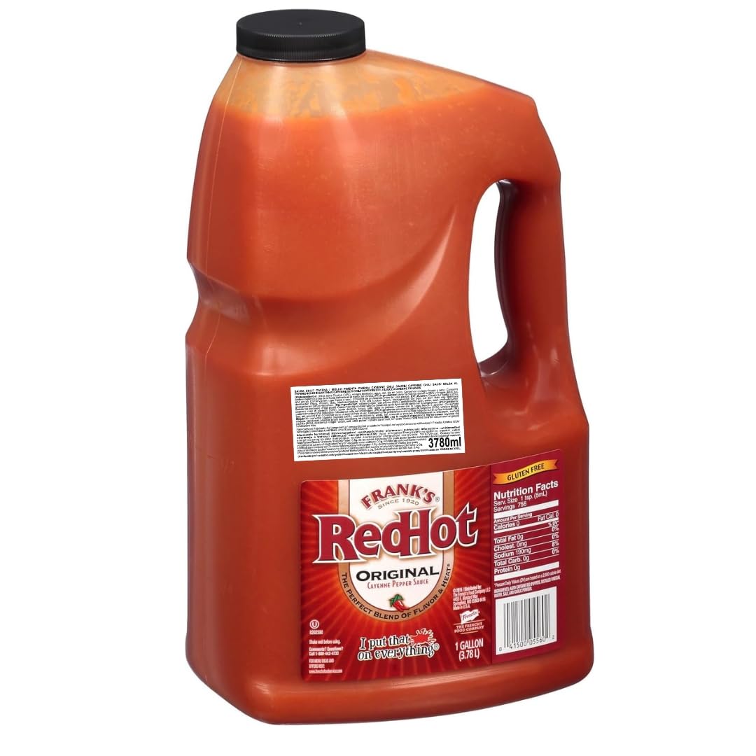 3.78 liter bottle with EU labeling. No. 1 salsa in the USA. Add a spicy and aromatic touch to your favorite dishes: burgers, meats, nachos, shrimp, fish, rice, eggs, cocktails, etc. Exceptional flavor and aroma, with a moderate spiciness and 100 natural. FranksRed Hot Original is a premium cayenne chili sauce, made with the same original recipe that's been around for over 80 years.Bouteille de 3,78 litres avec étiquetage EU. Salsa n 1 aux USA. Ajoutez une touche épicée et aromatique à vos plats préférés: hamburgers, viandes, nachos, crevettes, poisson, riz, œufs, cocktails, etc. D'une saveur et d'un arôme exceptionnels, avec une touche épicée modérée et 100 naturelle. FranksRed Hot Original est une sauce pimentée Cayenne Chili de qualité supérieure, faite avec la même recette originale de plus de 80 ans.