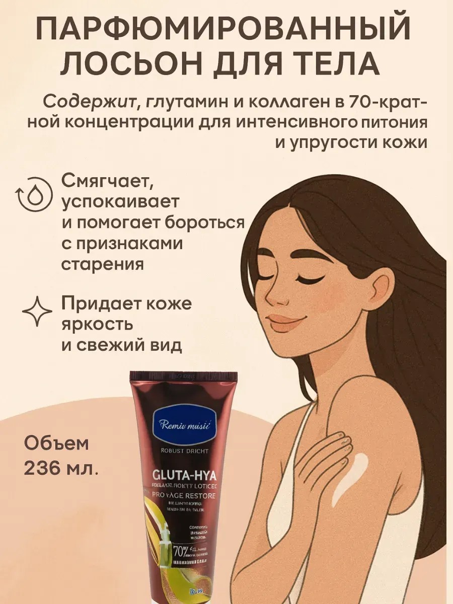 Антивозрастной лосьон для тела – это эффективное средство для глубокого увлажнения и питания кожи. В составе лосьона содержится высокая концентрация глутамина и коллагена, которые помогают восстановить упругость кожи, придать ей мягкость и шелковистость. Лосьон подходит для всех типов кожи, включая сухую и чувствительную, и обеспечивает комплексный уход, борясь с признаками старения и улучшая внешний вид кожи. Средство быстро впитывается, не оставляет липкости и дарит ощущение комфорта в течение всего дня. Объем 236 мл позволяет использовать продукт длительное время, а удобная туба легко помещается в сумку или косметичку. Лосьон идеально подходит для ежедневного применения, восстанавливает водный баланс кожи и придает ей здоровое сияние. Продукт станет отличным выбором для ухода за телом в домашних условиях, а также может быть прекрасным подарком для женщин, ценящих качественную косметику.