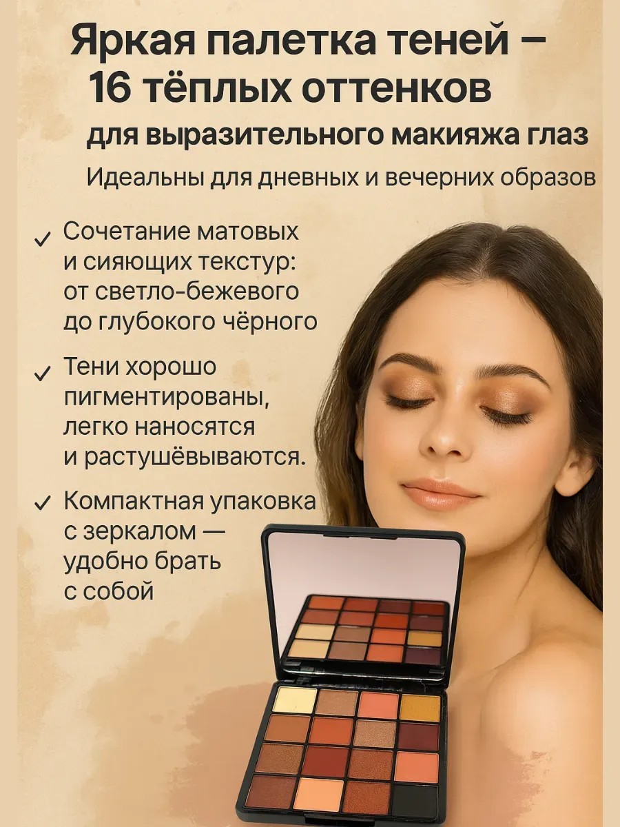 Палетка теней для век с 16 насыщенными оттенками — идеальный выбор для повседневного и вечернего макияжа. Ультрапигментированные матовые, сатиновые и шиммерные текстуры позволяют легко комбинировать цвета и создавать яркие образы. Палетка включает как нюдовые, так и тёплые терракотовые, коралловые, золотистые и бордовые тона, которые подойдут для любого цвета глаз и типа кожи. Тени легко наносятся, хорошо растушёвываются и не осыпаются в течение дня. Зеркало в комплекте делает использование палетки удобным в дороге или в поездке. Компактный формат позволяет брать косметику с собой в сумочке. Палетка идеально подойдёт для визажистов, начинающих и профессионалов, а также станет отличным подарком девушке, подруге или коллеге. Продукт предназначен для макияжа глаз, не вызывает раздражения, отличается стойкостью и насыщенным цветом. Универсальная палетка теней — отличный выбор для яркого и стильного макияжа на каждый день.