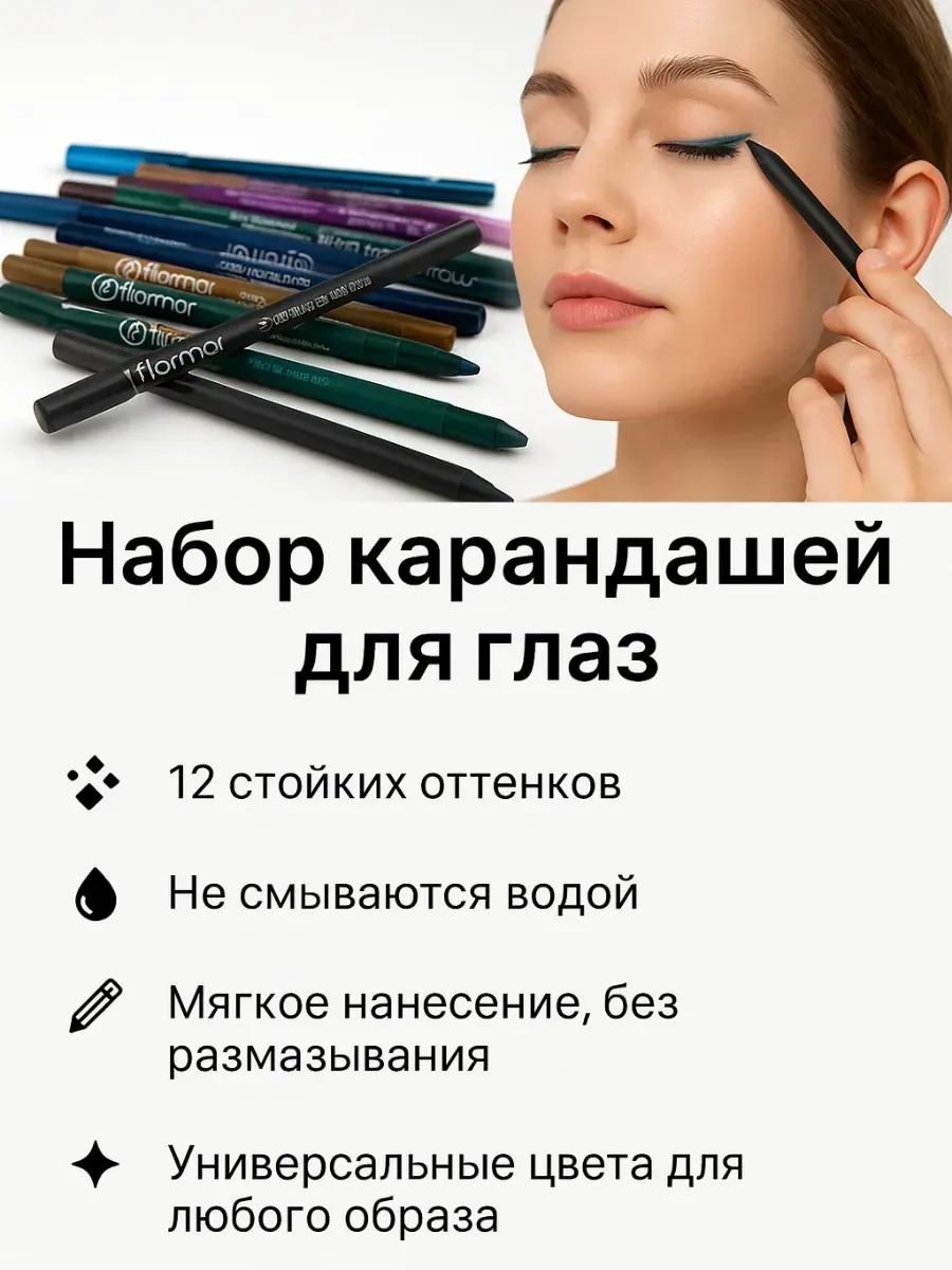 Набор водостойких карандашей для глаз Flormar — это идеальный выбор для стойкого и выразительного макияжа. В комплект входит 12 цветных карандашей для глаз в самых популярных и трендовых оттенках: чёрный, белый, коричневый, золотистый, серебристый, синий, зелёный, фиолетовый, бирюзовый и другие. Карандаши легко наносятся, мягко скользят по веку, не царапают кожу и отлично растушёвываются. Благодаря стойкой формуле они не размазываются и не смываются водой, сохраняя яркость и чёткость линий в течение всего дня. Подходят для создания стрелок, оформления слизистой и межресничной зоны. Цветные карандаши подойдут как для дневного, так и вечернего макияжа, подчеркивая взгляд и делая его более выразительным. Идеальны для чувствительных глаз и для тех, кто носит контактные линзы. Набор профессиональных карандашей — это must-have для любого визажиста и отличное решение для повседневного макияжа.
