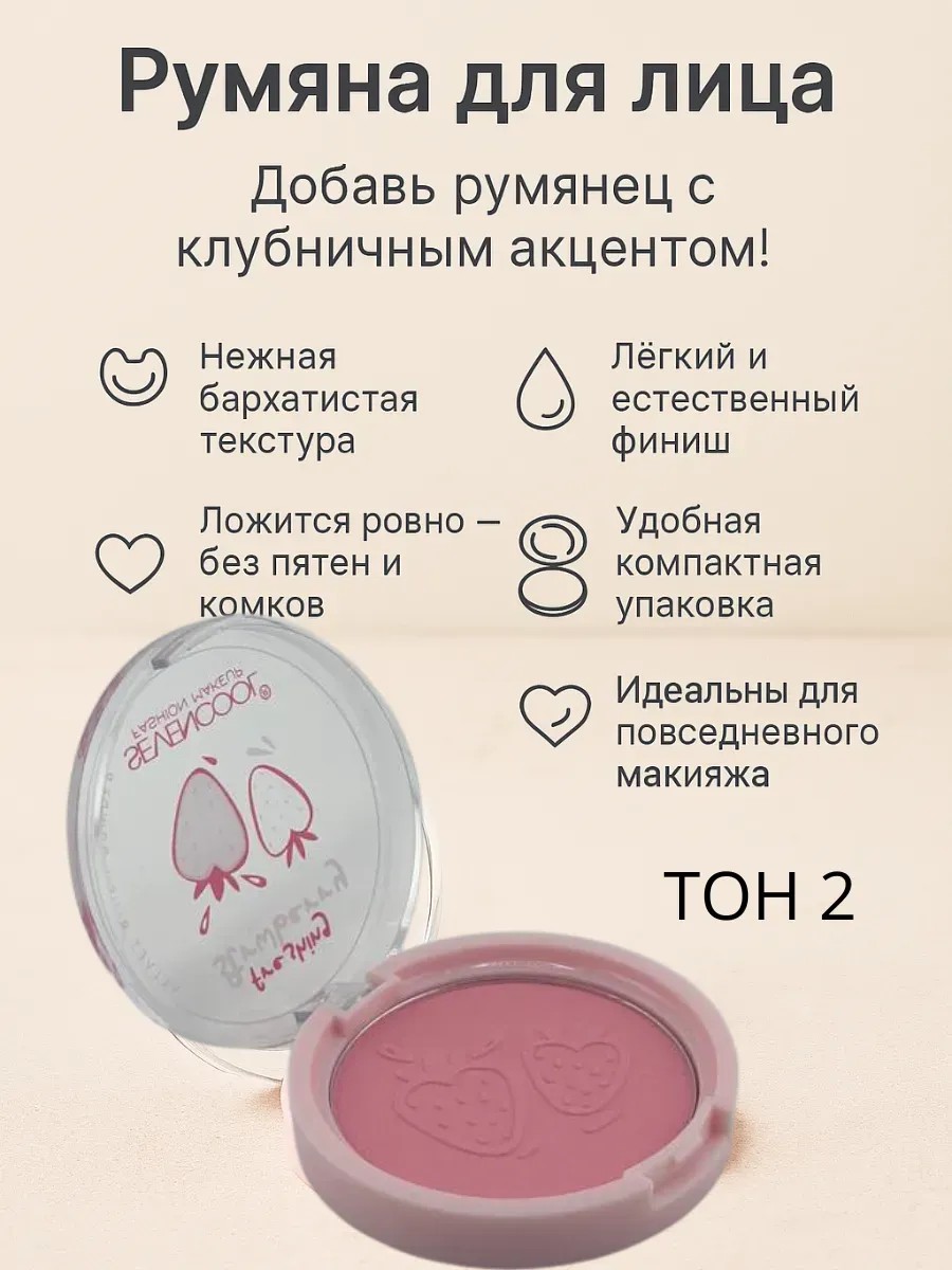 Румяна для лица тон 2 с клубнично розовым оттенком идеально подойдут для создания свежего и натурального макияжа.. Нежная бархатистая текстура легко наносится, равномерно распределяется без пятен и комков, подчёркивая естественную красоту кожи. Этот универсальный оттенок гармонично смотрится на любом тоне лица, придавая щёчкам лёгкий здоровый румянец. Компактная упаковка удобна для косметички и идеально подойдёт для повседневного использования. Румяна устойчивы, хорошо держатся в течение дня и не требуют постоянного подкрашивания. Продукт подойдёт для любого типа кожи и станет отличным выбором как для дневного, так и для вечернего макияжа. Румяна с ягодным оттенком пользуются большим спросом среди покупателей, благодаря своей универсальности, стойкости и лёгкости в нанесении.