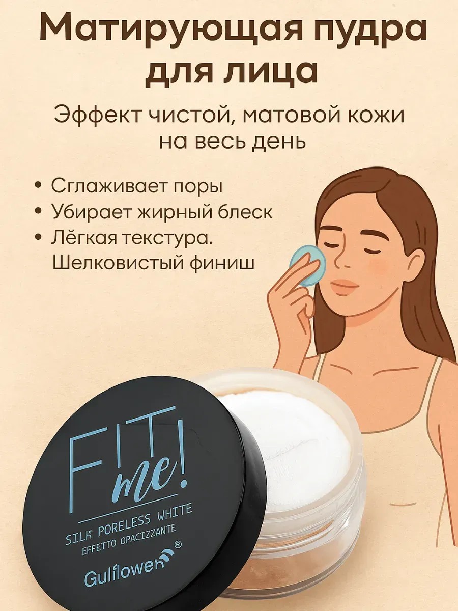 Рассыпчатая пудра для лица — это универсальное матирующее средство для завершения макияжа, которое обеспечивает стойкий эффект чистой, бархатистой и ухоженной кожи. Лёгкая шелковистая текстура равномерно распределяется по коже, не утяжеляя макияж и не забивая поры. Пудра эффективно устраняет жирный блеск, выравнивает тон лица и визуально сужает поры, создавая эффект фотошопа без фильтров. Идеально подходит для жирной, комбинированной, нормальной и проблемной кожи. Подходит для ежедневного использования, не вызывает раздражений. Косметическое средство представлено в компактной удобной баночке с дозатором и пуховкой, что делает его идеальным вариантом для нанесения макияжа дома и в дороге. Отличный выбор для девушек, ищущих пудру с матовым финишем, выравнивающим эффектом и невидимым покрытием. Пудра для лица, фиксирующая пудра, финишная пудра, матирующая пудра для жирной кожи — всё это про данное средство, которое пользуется высоким спросом среди покупателей.