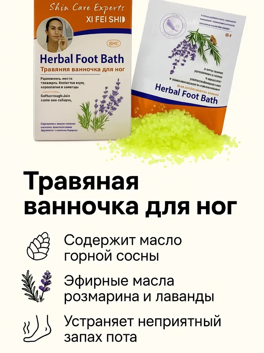 Травяная ванночка для ног с натуральными экстрактами и эфирными маслами горной сосны, розмарина и лаванды — эффективное средство для педикюра и SPA-процедур в домашних условиях. Средство быстро размягчает огрубевшую кожу стоп, помогает удалить мозоли, натоптыши и заживить трещины, делает кожу мягкой, гладкой и ухоженной. Благодаря натуральному составу ванночка не только ухаживает за кожей, но и устраняет неприятный запах пота, обеспечивая длительное ощущение свежести. Продукт подходит для регулярного применения, помогает снять усталость и напряжение ног после рабочего дня, улучшает кровообращение и подготавливает стопы к дальнейшему уходу. Легко растворяется в теплой воде, создавая ароматическую ванну с расслабляющим эффектом. Идеально для домашнего педикюра, ухода за ногами в зимний и летний период, профилактики сухости и шелушений кожи стоп. Отличный выбор для тех, кто ценит натуральный уход и комфорт.