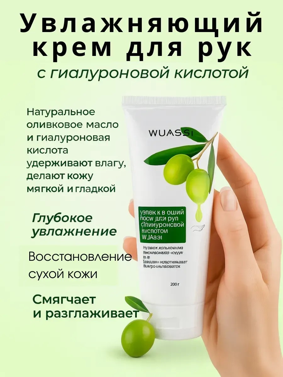 Увлажняющий крем для рук с гиалуроновой кислотой Wuassi – это идеальное средство для ежедневного ухода за кожей рук. Крем глубоко питает и восстанавливает сухую и грубую кожу, возвращая ей мягкость и гладкость уже с первого применения. В составе средства натуральное оливковое масло, гиалуроновая кислота и комплекс восстанавливающих компонентов, которые интенсивно удерживают влагу и предотвращают сухость. Легкая текстура крема быстро впитывается и не оставляет липкости, делая уход максимально комфортным в любое время суток. Средство подходит для всех типов кожи и эффективно решает проблему сухости, шелушения и раздражения. Этот крем станет незаменимым помощником в холодное время года, защищая руки от воздействия ветра и мороза, а также летом при частом контакте с водой и моющими средствами. Благодаря удобной упаковке объемом 200 мл крем можно всегда держать под рукой дома, на работе или в сумке.