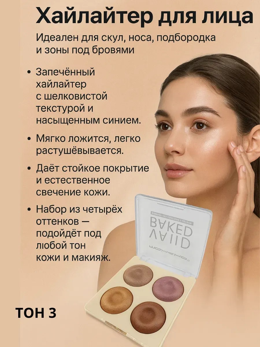 Хайлайтер для лица - это универсальное средство для макияжа, которое придаёт коже выразительное сияние, подчёркивает скулы, контур лица и создаёт эффект свежести и молодости. Запечённая формула обеспечивает стойкий результат, легко наносится и равномерно растушёвывается, не осыпается и не скатывается в течение дня. Благодаря насыщенной пигментации хайлайтер подходит как для дневного, так и вечернего макияжа. Идеален для создания эффекта сияющей кожи, глянцевого финиша и естественного подсвечивания. Текстура мягкая, шелковистая, подходит для всех типов кожи. Набор из нескольких оттенков позволяет подобрать нужный тон для любого образа. Популярный выбор среди визажистов и любителей профессионального макияжа.