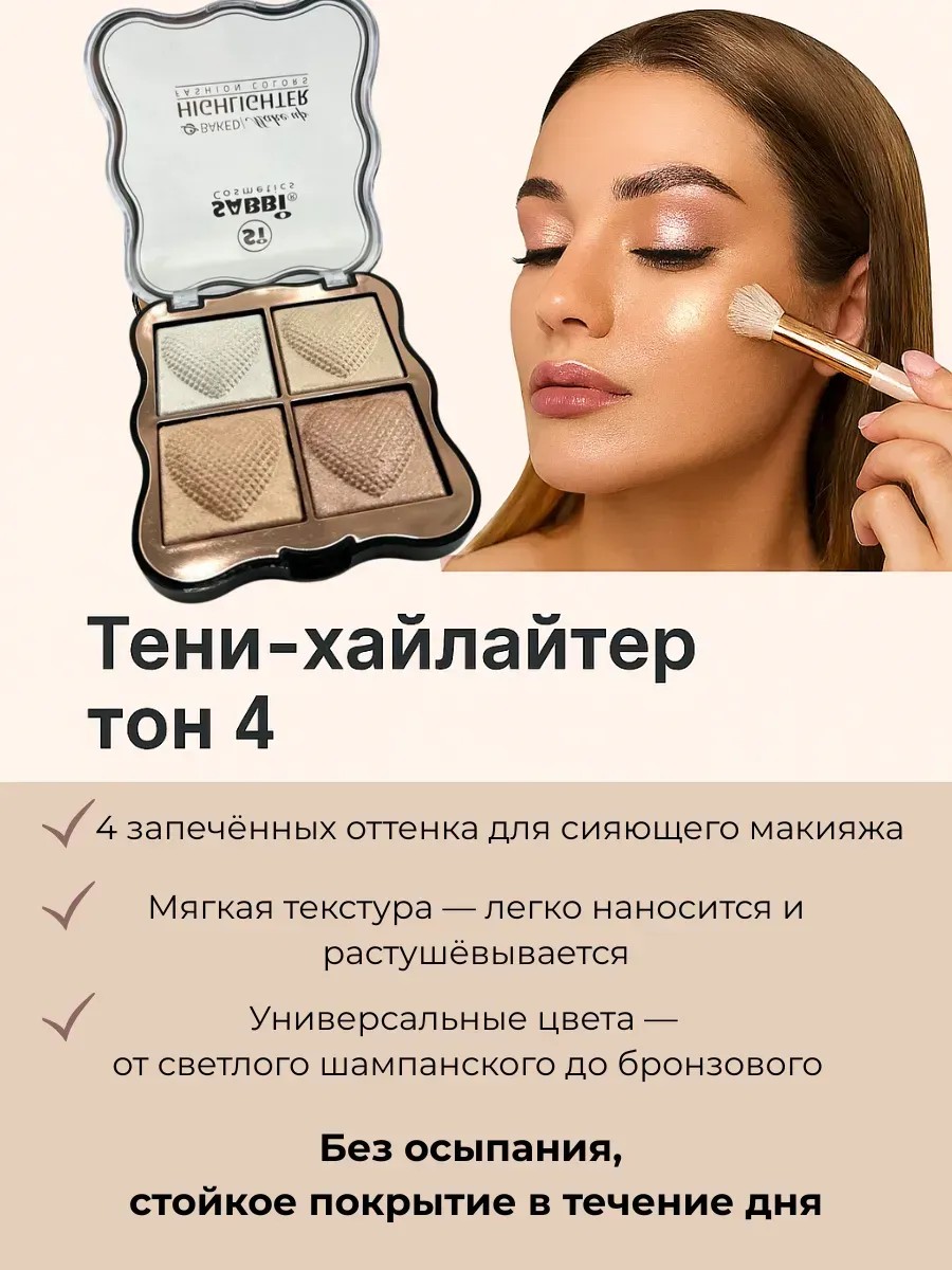 Тени хайлайтер тон 4 — универсальная палетка из четырёх запечённых сияющих оттенков для создания выразительного макияжа лица, глаз и тела. Светлый жемчужный, бежево-золотистый, оттенок шампанского и насыщенный бронзовый позволяют добиться естественного сияния или яркого акцента. Хайлайтер легко наносится, обладает мягкой текстурой и равномерно растушёвывается без пятен. Стойкая формула не осыпается и сохраняет эффект в течение всего дня. Идеально подходит для сухой, нормальной и комбинированной кожи, не подчёркивает шелушения. Запечённая текстура придаёт коже здоровый блеск и визуальный объём. Палетка компактная, удобно брать с собой в дорогу или сумочку. Отлично подходит для повседневного и вечернего макияжа, как для профессионалов, так и для начинающих. Хайлайтер используется для скул, подбровной зоны, носа, губ и ключиц.