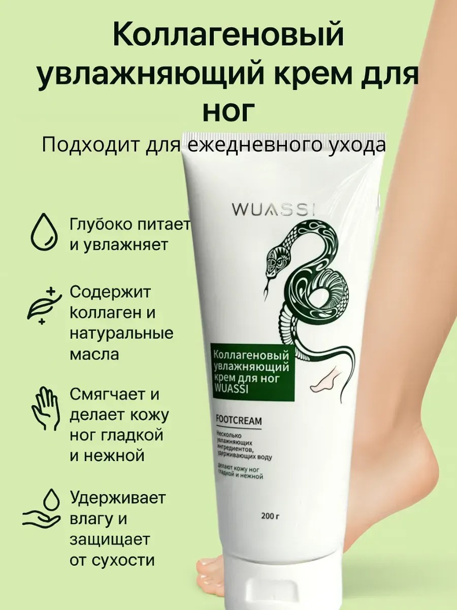 Коллагеновый увлажняющий крем для ног WUASSI – это эффективное средство для ежедневного ухода за кожей стоп, созданное для интенсивного питания, увлажнения и защиты. Благодаря уникальной формуле с коллагеном, витамином Е, экстрактом улитки и натуральными маслами крем глубоко питает кожу, восстанавливает естественный водный баланс и предотвращает сухость и появление трещин. Легкая текстура быстро впитывается, не оставляя липкости, делая кожу ног гладкой, нежной и ухоженной. Крем подходит для всех типов кожи и может использоваться в любое время дня и ночи. Объем 200 мл идеально подходит как для домашнего использования, так и для путешествий. Средство рекомендовано для комплексного ухода за ногами, особенно в зимний и летний период, когда кожа нуждается в повышенном увлажнении и защите. Крем для ног с коллагеном поможет восстановить упругость и мягкость кожи, улучшить ее внешний вид и предотвратить появление раздражения.