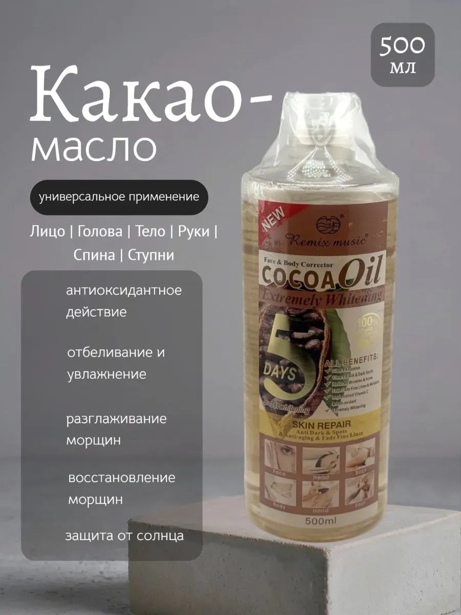 Натуральное масло какао с витамином Е для лица и тела разработано для интенсивного осветления кожи и устранения пигментных пятен, следов от акне и неровного тона. Масло эффективно работает как отбеливающее средство от пятен на коже, обладает восстанавливающим и питательным действием, подходит для всех типов кожи, включая чувствительную. Благодаря своему составу масло не содержит парабенов, насыщает кожу антиоксидантами и способствует разглаживанию морщин. Какао-масло можно использовать как масло для кожи головы, спины, рук, ступней и других зон, требующих ухода. Оно идеально подходит для повседневного применения и может использоваться как массажное масло, обеспечивая расслабляющий эффект и глубокое увлажнение. Действует быстро — результат заметен уже через 5 дней. Объём 500 мл делает его отличным выбором для домашнего ухода. Это универсальное масло для отбеливания, которое работает как корректор для лица и тела, особенно при наличии тёмных пятен, шрамов, сухости или следов от прыщей. Идеально как отбеливающее масло от морщин и трещин.