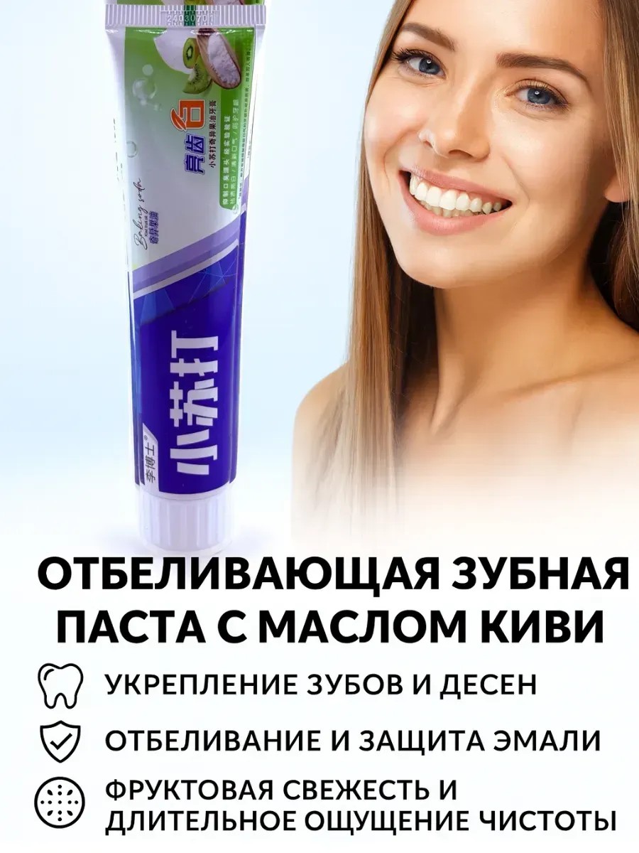 Toothpaste with baking soda and kiwi extract is an effective teeth whitening and oral care product. Thanks to the baking soda content, the toothpaste gently cleanses enamel, removes plaque, and freshens breath. Baking soda helps eliminate bad breath and helps prevent cavities and inflammation. Natural kiwi extract has a gentle caring effect, strengthens gums, and imparts freshness. Suitable for daily use, this toothpaste ensures oral hygiene and protection from bacteria. The pleasant fruity flavor makes brushing comfortable for adults and children aged 6 and older. This toothpaste with baking soda is an ideal choice for those looking for an affordable, high-quality whitening toothpaste with natural ingredients. Convenient packaging in a 180g tube allows for economical use. Made according to modern standards, it is suitable for the whole family. It lathers well, rinses easily, and leaves teeth noticeably cleaner after just the first use.