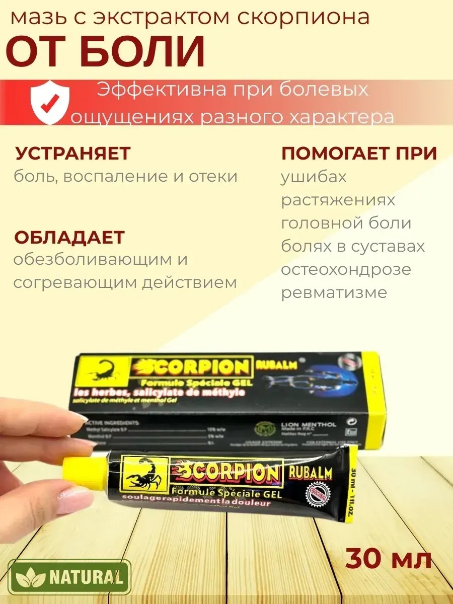 Чудо-мазь с ядом скорпиона — Scorpion мазь для суставов это натуральное эффективное средство, созданное на основе уникальных природных компонентов. Главный активный ингредиент — яд скорпиона, известный своими мощными целебными и обезболивающими свойствами. Эта китайская мазь от болей помогает быстро облегчить даже самые сильные боли и восстановить подвижность.