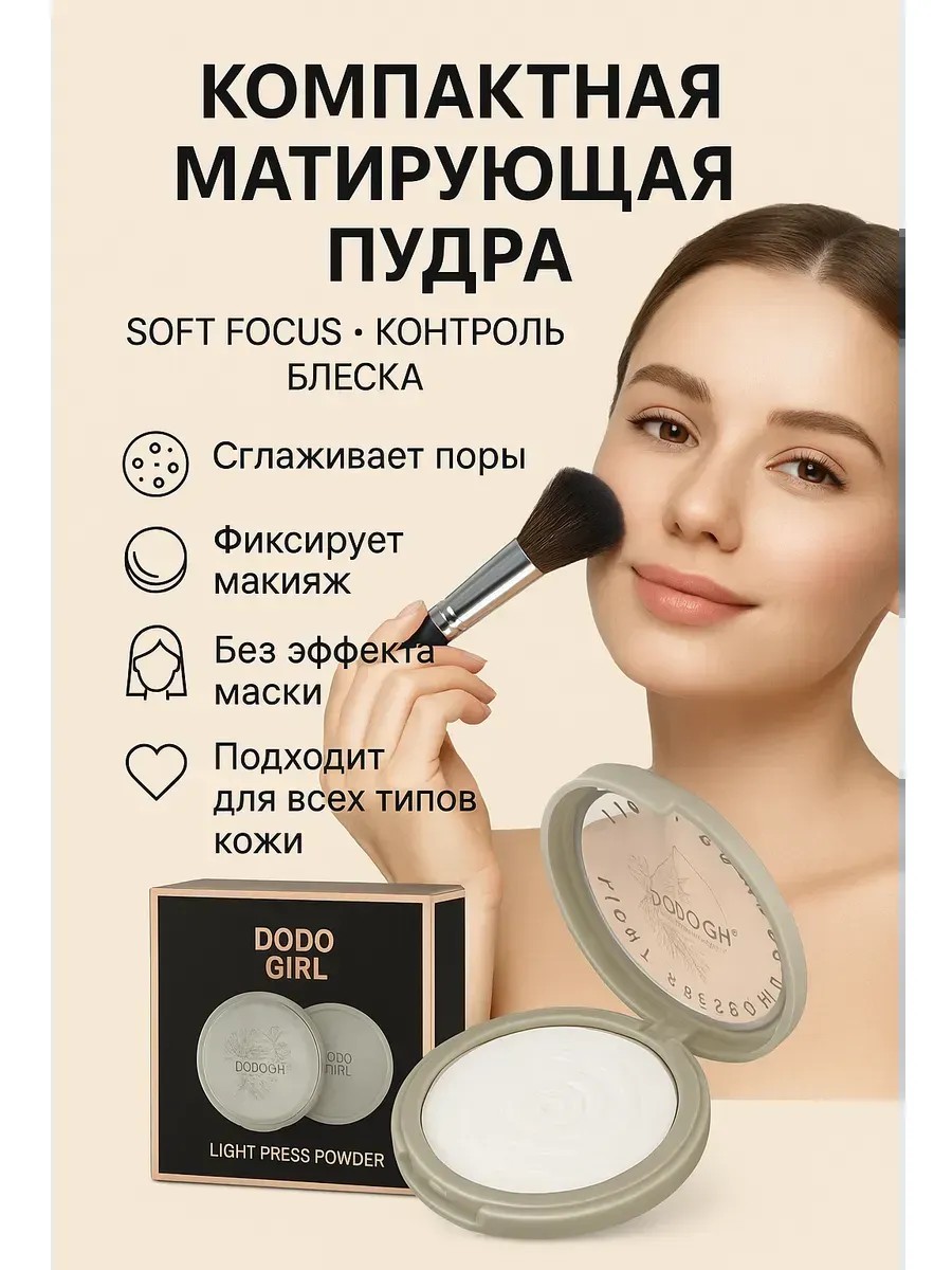 Компактная матирующая пудра для лица DoDo Girl — идеальный «must-have» для тех, кто ищет прозрачную фиксирующую HD Blur Soft Focus пудру с эффектом «фотошопа» без маски. Лёгкая минеральная формула мгновенно контролирует жирный блеск, скрывает поры, выравнивает рельеф и дарит устойчивый матовый финиш до 8 часов даже в условиях жары и влажности. Средство работает как водостойкая пудра от жирного блеска: макияж остаётся свежим после тренировки, похода на пляж или активного дня в городе.