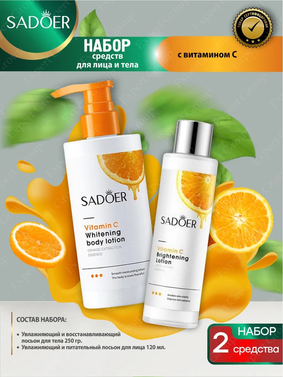 | Полное наименование товара | Подарочный набор уходовой косметики увлажняющих лосьонов Sadoer с витамином С для тела 250 гр + для лица 120 мл. |