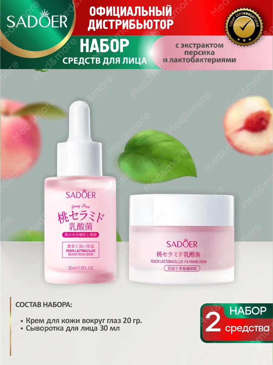 | Полное наименование товара | Набор средств для лица Sadoer с персиком и лактобактериями крем для век + сыворотка |
