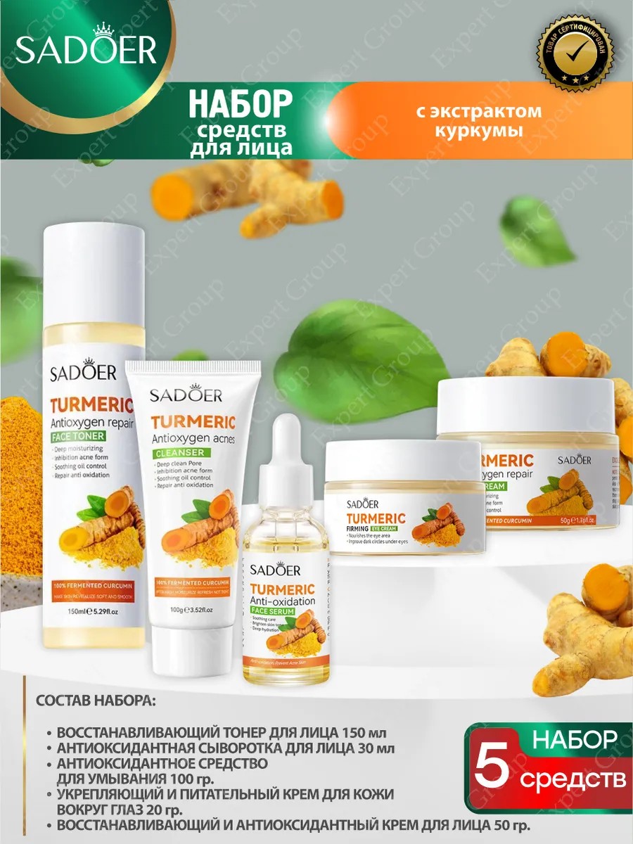 | Комплектация | Набор Sadoer с куркумой крем для глаз + крем для лица + средство для умывания + сыворотка + тонер |