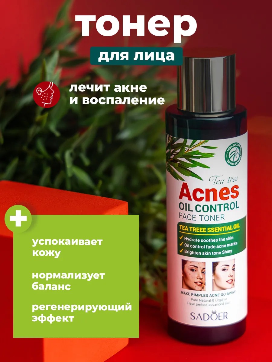 Тонер для лица против акне Sadoer с маслом чайного дерева 120 мл. Тоник-тонер для лица от акне обладает тонизирующим и увлажняющим действием, наносится, как правило, на очищенную кожу, перед применением эссенции или сыворотки для лица. Тонер подходит для обладательниц жирной, проблемной и чувствительной кожи. Масло чайного дерева в составе средства успокаивает раздраженную, чувствительную кожу, устраняя покраснения и воспаления. Также лечит акне и кожные высыпания в виде сыпи, прыщей. Масло нормализует работу сальных желез, затормаживая излишнюю выработку кожного сала, благодаря чему кожа становится матовой и здоровой, исчезает жирный блеск, улучшается цвет лица. Масло чайного дерева препятствует появлению угревой сыпи, лечит пост акне. После регулярного применения тонера выровняется тон и микрорельеф кожи, кожа станет сияющей и здоровой.