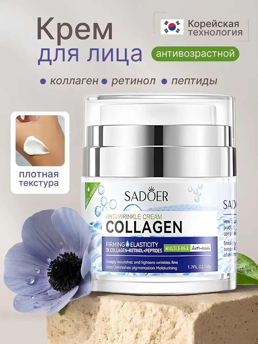Откройте для себя инновационное уходовое средство для восстановления, увлажнения и омоложения зрелой возрастной кожи, а также для профилактики признаков старения у девушек и мужчин. Антивозрастной крем для лица Sadoer Collagen Face Cream с коллагеном и пептидами эффективно борется с мимическими морщинами, обеспечивая коже увлажнение, питание и защиту.