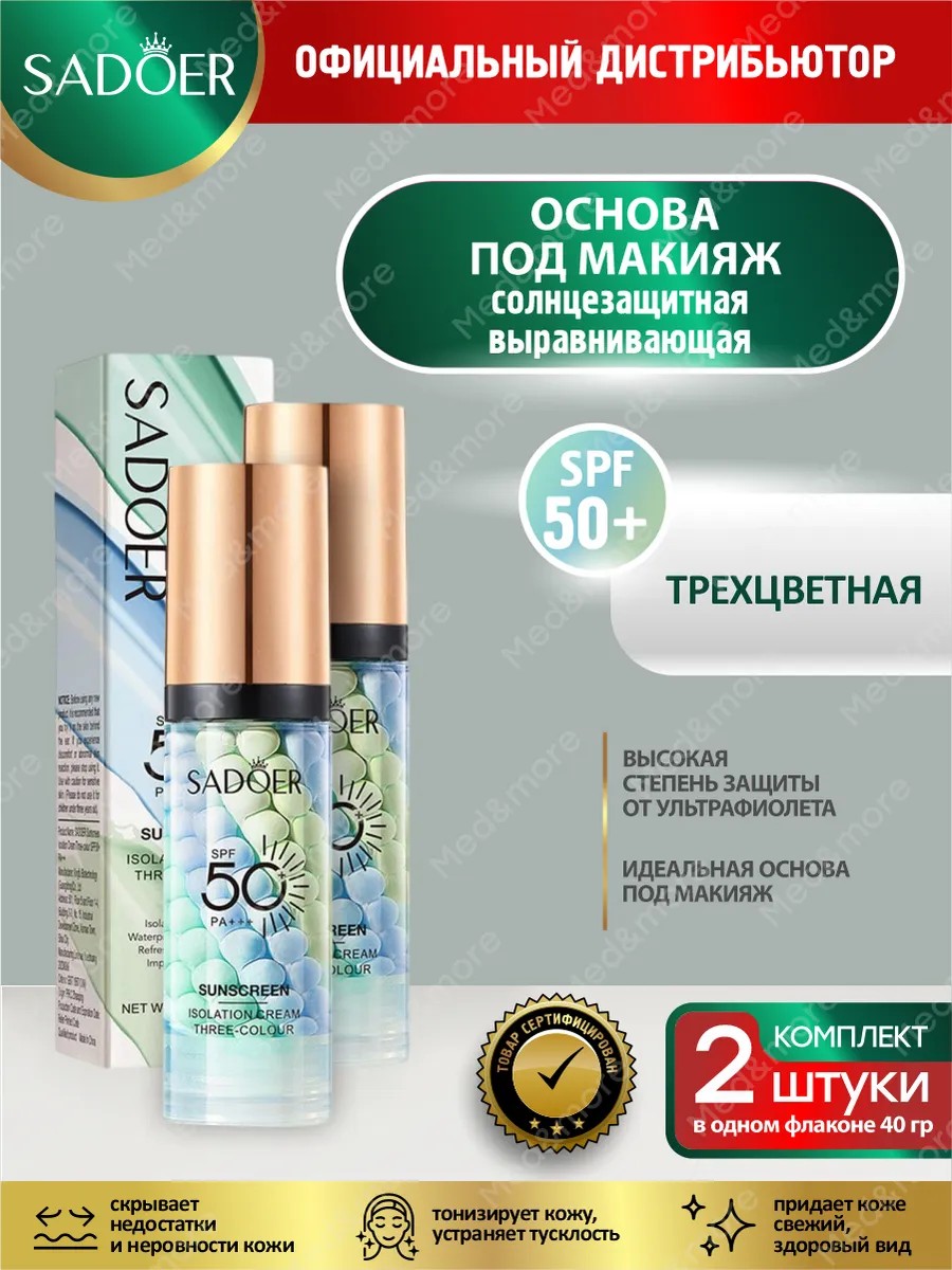 | Полное наименование товара | Комплект Солнцезащитная трёхцветная выравнивающая основа под макияж SPF50+ PA+++ Sadoer 40 гр х 2шт. |