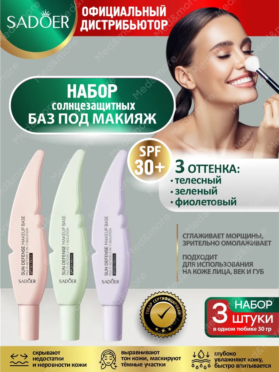 В набор входит: Увлажняющая солнезащитная база под макияж Sadoer SPF30+ PA+++ телесный оттенок 30 гр., Увлажняющая солнезащитная база под макияж Sadoer SPF30+ PA+++ зеленый оттенок 30 гр., Многофункциональная База под макияж Sadoer с защитой от солнца SPF30+ PA+++ фиолетовая 30 гр.