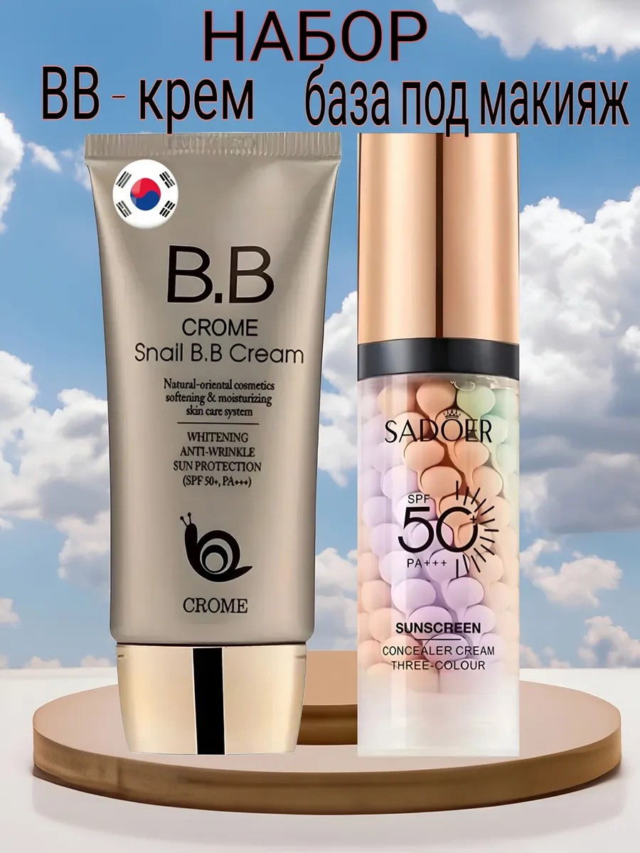 Легендарный набор из двух топовых средств для идеального тона. Корейский ВВ крем с SPF фильтром эффективно маскирует недостатки и ухаживает за кожей, обладает регенерирующими и защитными свойствами. Этот увлажняющий корейский ВВ крем с SPF 50 продлевает молодость и обеспечивает профессиональный уход. Легкий тонирующий ВВ крем отличается невероятной стойкостью, сочетая свойства консилера и тональной основы. Макияж с ним всегда безупречен. Крем борется с несовершенствами, придает здоровый и ровный оттенок, обеспечивает невесомое и стойкое покрытие, не течет и не скатывается даже под дождем. Активный компонент — Фильтрат улиточного муцина — оказывает регенерирующее, омолаживающее, увлажняющее, восстанавливающее и антибактериальное действие, а также осветляет и заживляет. ВВ крем не только корректирует недостатки, но и заживляет, увлажняет, осветляет, избавляя от пигментации и следов постакне и создавая эффект гладкой кожи. Защитный корректор из Кореи также борется с воспалениями и маскирует их. Дополнительные свойства муцина включают синтез коллагеновых и эластиновых волокон, что разглаживает микрорельеф кожи, повышает ее плотность, упругость и эластичность. Корректор имеет SPF 50 и PA+++ защиту, оберегая кожу от UVA-излучения, которое составляет 80% даже в пасмурную погоду.