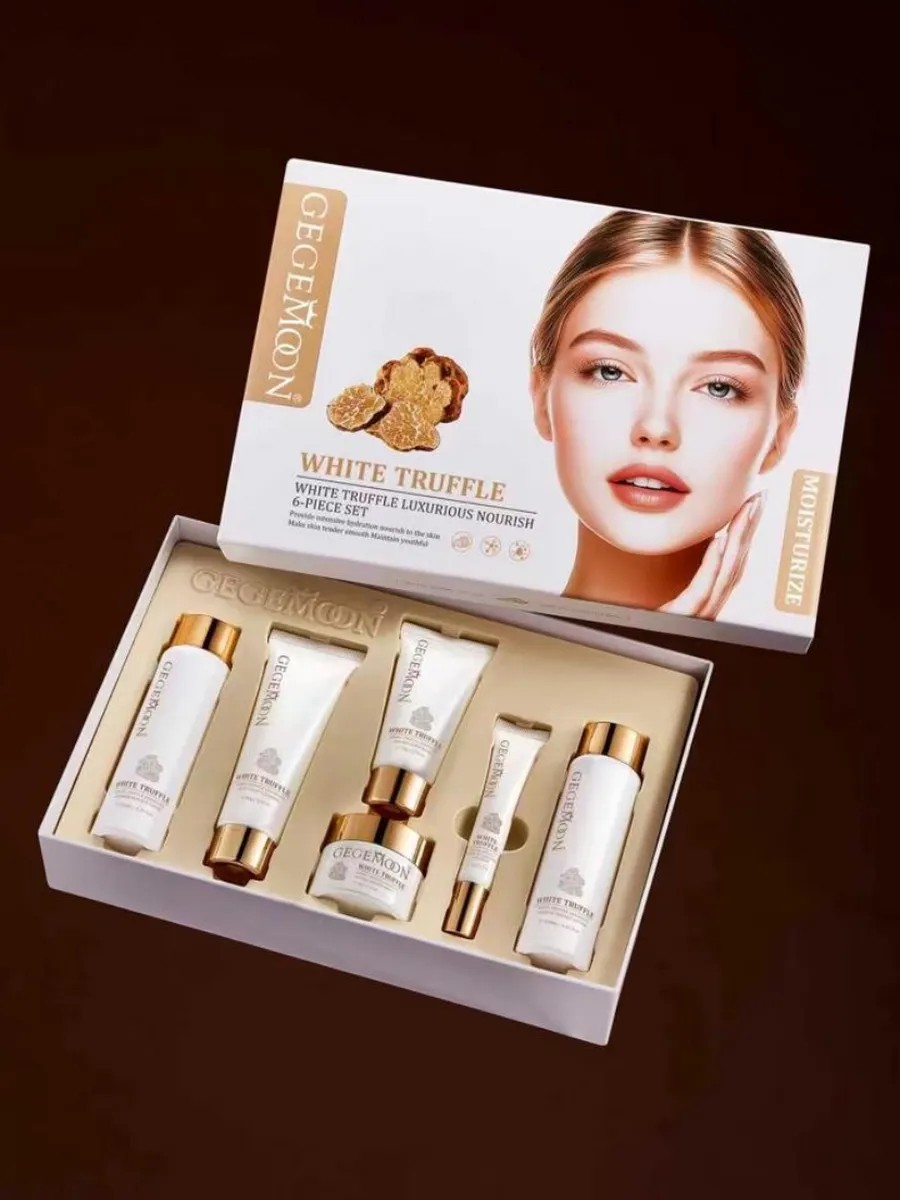 A gift set of facial care cosmetics with white truffle ANTI-AGE from the GEGEMOON brand - products for daily use in a beautiful beauty box. The care set consists of 6 items: cleansing milk (80g), facial toner (120ml), lotion (120ml), night mask (50g), eye cream (20ml), facial cream-essence (50g). Beauty box cosmetics for women's facial care - a gift for a friend, wife, girlfriend, mother, sister, or woman for a birthday. This premium cosmetics set is an excellent gift for a birthday, anniversary, or March 8th. The products have antioxidant properties, stimulate collagen and elastin synthesis, fight age-related changes, and also have an anti-inflammatory effect, relieve irritation and protect against harmful environmental effects. Centella asiatica, verbena, rosemary and other active nutritional ingredients. The products in the set complement each other to ensure optimal skincare results at home, with the same results as a visit to a cosmetologist. The facial care products are premium and of high quality. Korean ingredients and patented technologies.