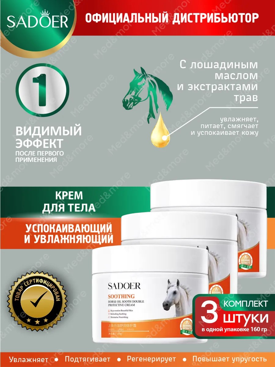 Успокаивающий и увлажняющий крем для тела Sadoer с лошадиным маслом и травами 160 гр х 3 шт. Крем для тела увлажняющий — сочетает в себе целебные свойства натуральных компонентов, чтобы обеспечить глубочайшее увлажнение и великолепное питание. Этот крем создан на основе уникальной формулы, которая сочетает в себе полезные свойства лошадиного масла и натуральных растительных экстрактов.