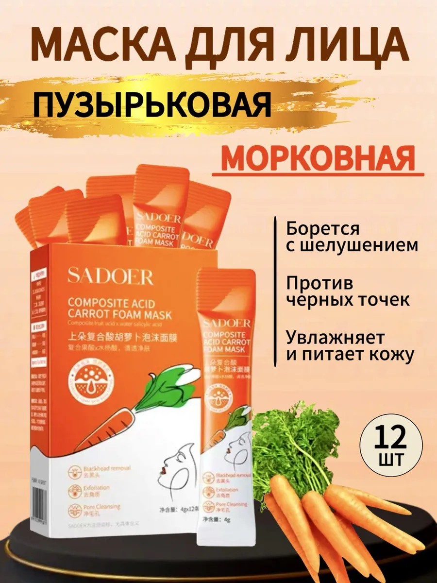 Маски для лица бренда Sadoer в подарочном наборе 12 шт. Профессиональное уходовое средство для лица, способное подарить коже красоту и молодость. Подарочный косметический набор создан для решения проблем кожи лица. Продукт нежно и эффективно ухаживает за вашей кожей, обеспечивая увлажнение, питание, и омолаживающий эффект. Очищающая и отбеливающая формула устраняет воспаления, избавляет от прыщей, от отеков, акне и черных точек. Средство подходит для всех типов кожи и возрастов, способствует сужению пор и придаёт коже матовость и гладкость. Благодаря своей мягкости и гипоаллергенной формуле, оно не вызывает раздражения и подходит для самой чувствительной кожи. Будьте уверены, что ваша кожа получит все необходимые вещества для её увлажнения, питания. Омолаживающая косметика всегда была известна своим качеством и эффективностью. Подарочный набор для женщин обогащает ваш ежедневный уход 30 различными активными ингредиентами. Масочки для лица – неотъемлемая часть уходовой рутины чтобы поддерживать свою кожу в идеальном состоянии. Морковная маска для лица - лучшее решение против авитаминоза, воспалений, покраснений, шелушения, прыщи, угри, нездоровый цвет лица, сильная пигментация. С этими проблемами справляется очищающая пузырьковая маска с бета-каротином. Это идеальное косметическое средство для глубокого очищения кожи. Маска морковная устраняет сухость и шелушение, стимулирует выработку собственного коллагена возвращает коже упругость и тонус, Основной компонент - экстракт моркови, который является омолаживающим средством благодаря высокому содержанию Бета-каротина, способствует регенерации клеток кожи и защищает ее от преждевременного старения. В отличие от обычной тканевой маски или глиняной маски, пузырьковая маска имеет кремовую текстуру. При контакте с кожей композитная маска из моркови превращается в пенную пузырьковую массу, благодаря чему активные вещества проникают в глубинные слои эпидермиса, запуская восстанавливающие и омолаживающие процессы.