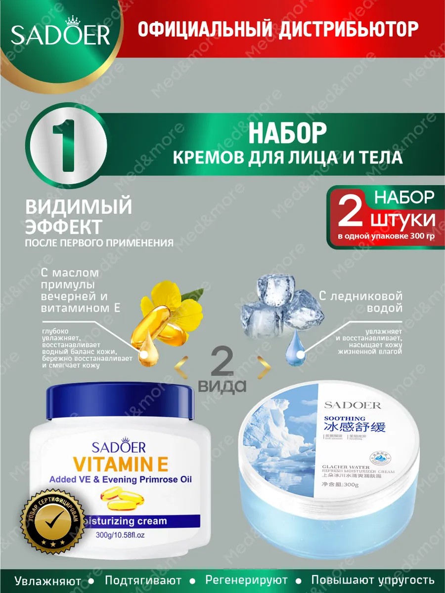 | Полное наименование товара | Набор кремов для лица и тела Sadoer с витамином Е и маслом примулы вечерней+с ледниковой водой |