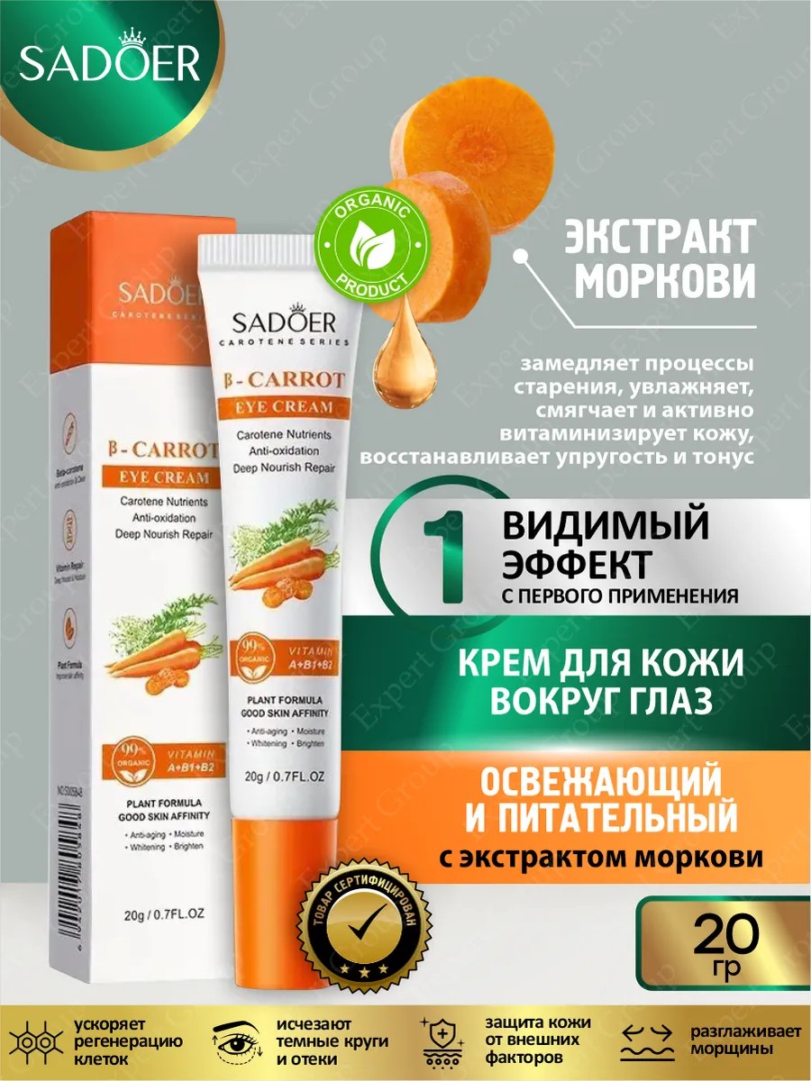 | Комплектация | Освежающий и питательный крем для кожи вокруг глаз Sadoer с экстрактом моркови 20 гр |