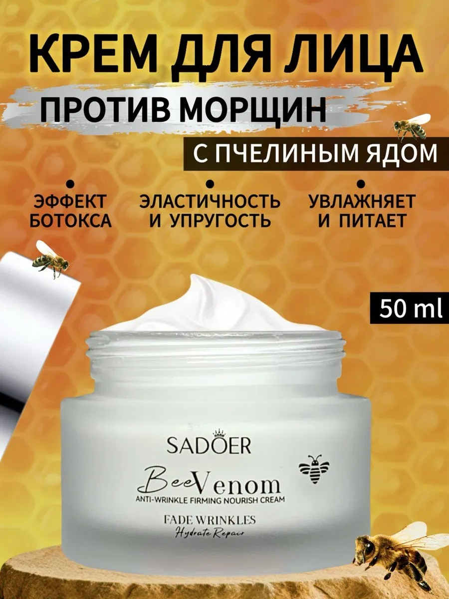 Увлажняющий крем для лица с пчелиным ядом sadoer – эффективная уходовая косметика с комплексом полезных активных енгредиентов! Профессионально подобранная сбалансированная формула интенсивно питает и увлажняет кожу, делая ее мягкой и гладкой. В основе средства для базового ежедневного ухода ниацинамид диметикон и гиалуроновая кислота. Эти компоненты помогают удерживать влагу в эпидермисе, предотвращая его обезвоживание. Также в составе крема против морщин комплекс аминокислот и коллаген. Они входят в состав натурального увлажняющего фактора. Аминокислоты делают дерму более упругой и эластичной. Они выравнивают тон и микрорельеф кожи, улучшая ее текстуру. Компоненты помогают в борьбе против пигментации. Этот питательный крем содержит богатую композицию пептидов прополиса и пчелиного яда, которые день за днем обеспечивают активное омоложение. Яд пчелы способствует расслаблению мышц лица. Маточное молочко, присутствующее в креме, состоит из глюкозы, фруктозы, сахарозы, витаминов А, D, С, группы В, Е, РР, аминокислот и минеральных солей. Эти ингредиенты не только обеспечивают оптимальное питание кожи, но и помогают улучшить ее общее состояние. Известно, что пептиды пчелиного яда, присутствующие в увлажняющем креме, стимулируют выработку коллагена, что помогает повысить эластичность кожи и уменьшить появление мимических морщин. Это универсальный уходовый бьюти – продукт, который увлажнит кожу и обеспечит омолаживающий эффект. Формула средства подходит для дневного и ночного нанесения. Благодаря глубокому увлажнению она устраняет ощущение сухости, возвращая эпидермису красивое и здоровое сияние. Состав с антивозрастным эффектом способствует осветлению дермы и укреплению ее естественного защитного барьера. Продукт изготовлен по корейской технологии, и компонентов из Кореи. Он подходит для ухода за всеми типами женской кожи, включая сухую, нормальную и чувствительную. Укрепляющий крем станет отличным выбором для взрослых женщин и молодых девушек.