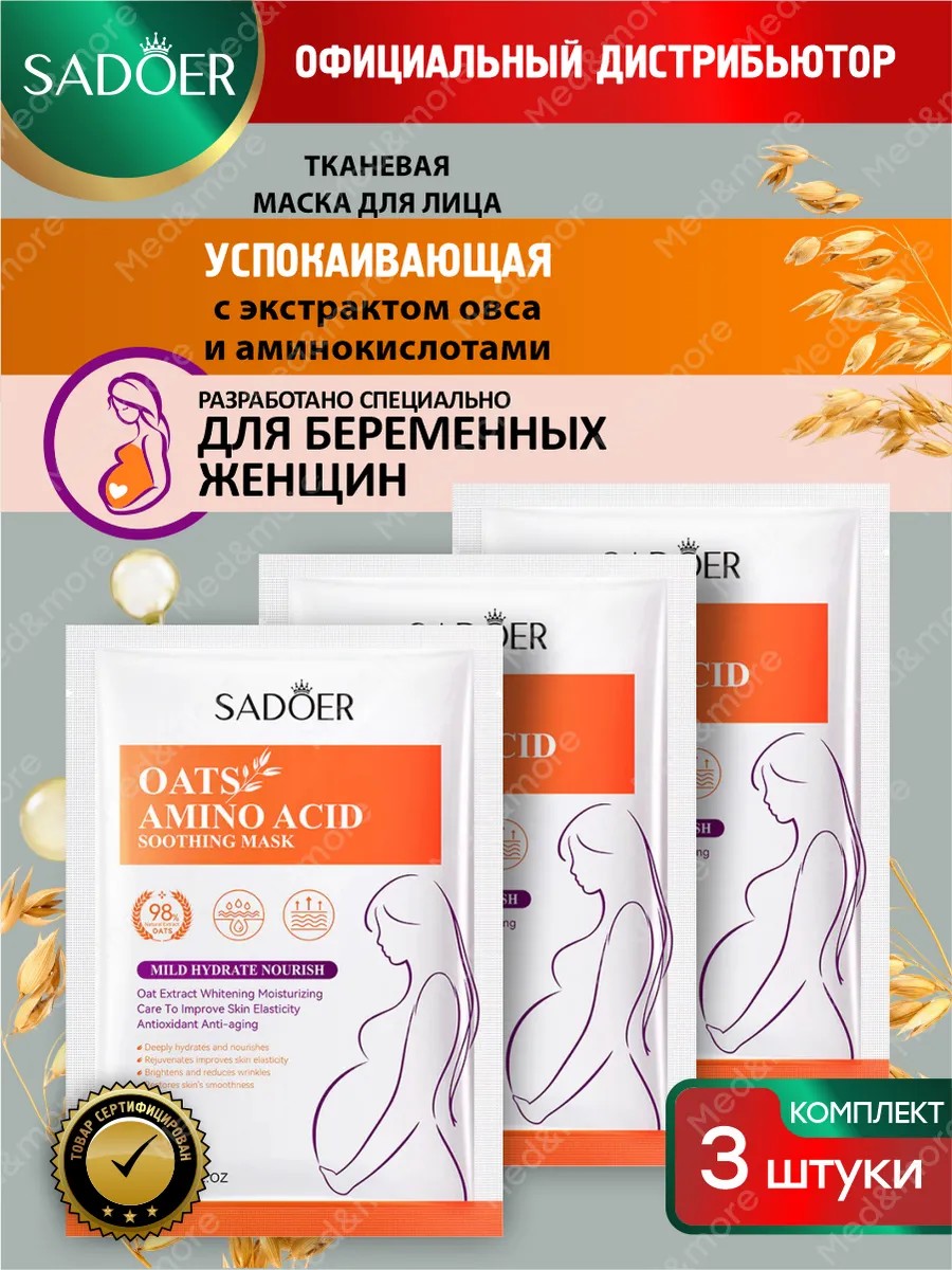 Успокаивающая тканевая маска для лица Sadoer с экстрактом овса и аминокислотами 30гр х 3 шт. Маска для лица тканевая разработана специально для беременных женщин, содержит высококонцентрированную сыворотку, насыщенную полезными веществами, которые помогают увлажнить, питать и тонизировать кожу, улучшить ее текстуру и цвет, а также уменьшить первые признаки старения.