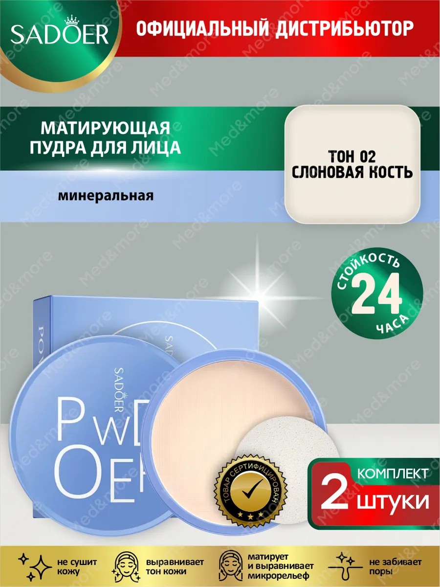 | Комплектация | Матирующая пудра для лица Sadoer тон 02 Слоновая кость 16 гр х 2 шт.; пудра для лица; пудра для лица матирующая; пудра для лица рассыпчатая; пудра рассыпчатая |