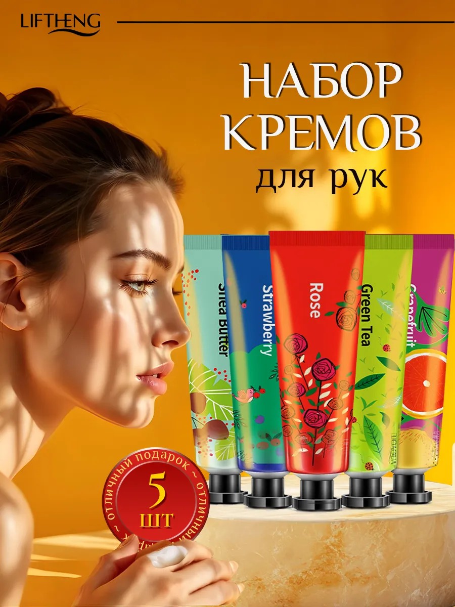 We present a set of five different hand creams in a convenient travel size! These high-quality care products with a comprehensive formula deeply moisturize and soften the skin, restoring its elasticity. They provide protection against dryness and flaking. Cosmetic products from the LIFTHENG brand have a restorative, healing, and rejuvenating effect. They contain glycerin, vitamin E, and natural plant extracts. The beauty box includes a cream with green tea extract, which soothes and reduces inflammation. The formula with grapefruit extract has an anti-aging effect and accelerates skin recovery after sun exposure. The "Forest Berries" cream accelerates regeneration, helping to eliminate flaking and cracking. The product with rose extract perfectly tones, creating a protective barrier. The formula with shea butter and coconut oil deeply nourishes, providing a soothing effect. The products come in small 30 ml tubes. They're convenient for use at home, carrying in your purse, or taking anywhere. A set of 5 creams is available as a gift for both adult women and young girls. They're suitable for all skin types, including sensitive skin. The creams have a pleasant scent and a light, non-waxy texture. They're an excellent choice for hand care during autumn, winter cold, and frost. Professional formulas with beneficial ingredients can be used morning, day, evening, and night, after a bath or shower. They'll help soften dry skin on your hands and elbows. This gift set will delight your beloved mother or grandmother. It's a wonderful present for a sister, wife, girlfriend, friend, mother, or colleague. Give beauty products for the New Year holidays, a birthday, March 8th, or any other special occasion. They'll also make a lovely gift for a mother-in-law, godmother, or mother-in-law. The brand also offers cream sets designed in a Christmas theme! We have special offers and sales, so you can buy our products as gifts at a discount!