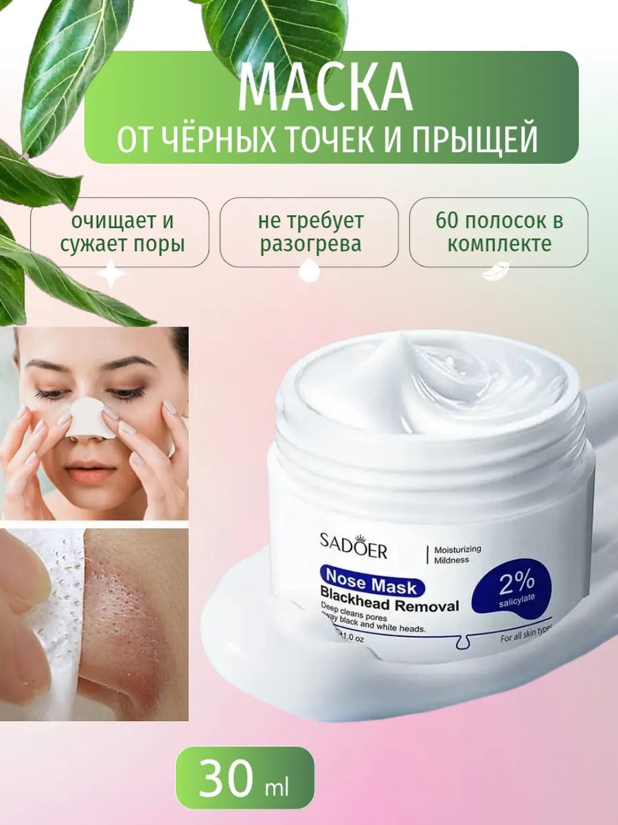 Очищающая маска реально работает! И такого эффекта не было ни от одной подобной маски. Впечатляющий результат-буквально за одно применение маска вытянет 80 процентов видимых черных точек, сальных пробок и прочих кожных загрязнений. Показания к применению белой маски против черных точек: сальные пробки, чёрные точки, открытые комедоны, угри, расширенные поры, а так же другие виды кожных загрязнений. Маска для проблемной кожи для лица удаляет загрязнения, очищает и сужает поры всего за 15 минут! Средство маска от черных точек для лица для удаления угрей и черных точек Sadoer эффективно выводит загрязнения и помогает сохранить вашу кожу чистой и здоровой. Полоски от черных точек борются с несовершенствами кожи, пластырь от черных точек на носу очищают поры, черные точки, акне и прыщи в области носа, подбородка и других частей лица. Маска пленка от черных точек для чистки лица подойдет для девочек подростков, женщин и мужчин с проблемной, жирной и сухой кожей. Маска от прыщей Sadoer подойдет и мужчинам и женщинам имеющих черные точки на носу и вокруг него. В отличии от маски для лица от черных точек и акне Lanbena маску Sadoer не нужно разогревать. В комплект входят очищающие полоски стикеры 60 штук. Косметическое средство поможет избавиться от черных точек в области носа, подбородка и других частей лица, а также от прыщей ,угрей, от акне. Маска белая снимает раздражение и купирует воспалительные процессы. Средство подойдет для девочек, подростков, а также женщин и мужчин с проблемной кожей. Косметическое средство выпускается в баночке для удобного хранения. Очищающая маска более эффективна, чем одноразовые тканевые маски, пленки, патчи, угольный крем, пилинг тоник, не уступает по свойствам очищающей маске и даже заменит чистку в салоне красоты. Черные точки на носу - распространенная проблема среди мужчин и женщин разного возраста. От них довольно сложно избавиться на длительный срок, ведь через 1-2 недели они снова появляются на том же месте. Черные точки и угорь на лице выглядят неэстетично, а без внимания к проблеме со временем к ним присоединяется воспаление, от которого нельзя избавиться без медицинской помощи.