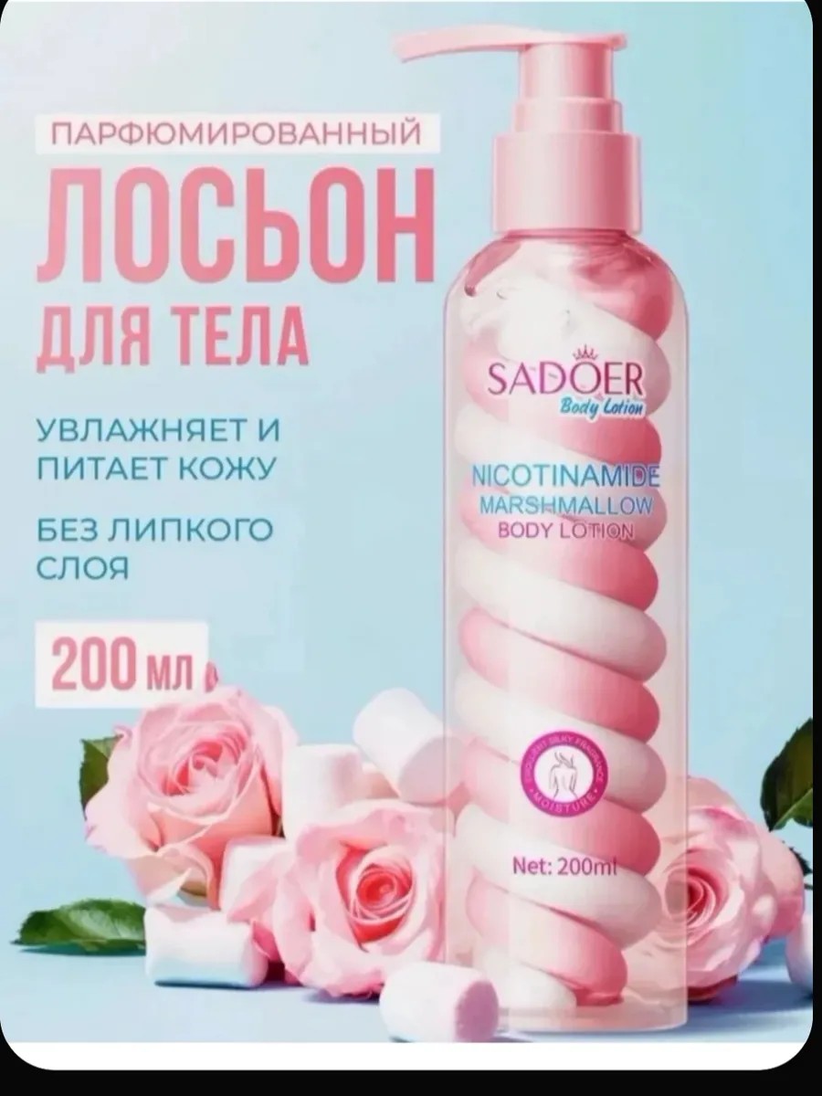 Увлажняющий, осветляющий, освежающий крем лосьон с легкой текстурой для тела. Крем Sadoer nicotinamide marshmallow body lotion -крем-зефирка с увлажняющими и питательными компонентами, идеально подходит для любых типов кожи, в том числе сухой и очень сухой кожи. Крем-лосьон с удобным дозатором (обязательно откройте лосьон, закройте, а потом покрутите дозатор и он выйдет) имеет нежный еле уловимый запах, на теле не пахнет!!! Обеспечивает интенсивное увлажнение и защиту от прыщей, делая вашу кожу мягкой и гладкой. Насладитесь парфюмированным молочком для тела зефирка с ароматом зефира, благодаря его тающей текстуре крем-зефирки, который погружает вас в мир комфорта и релаксации. Сияющий крем, разработанный специально для ухода за вашей кожей, делает ее здоровой и сияющей. Эффективное увлажнение для тела в виде лосьона и увлажняющего крема с ароматом обеспечивает оптимальный баланс увлажнения и питания. С помощью лосьона маршмелоу вы сможете осуществлять профессиональный уход за вашей кожей в комфорте домашней обстановки.