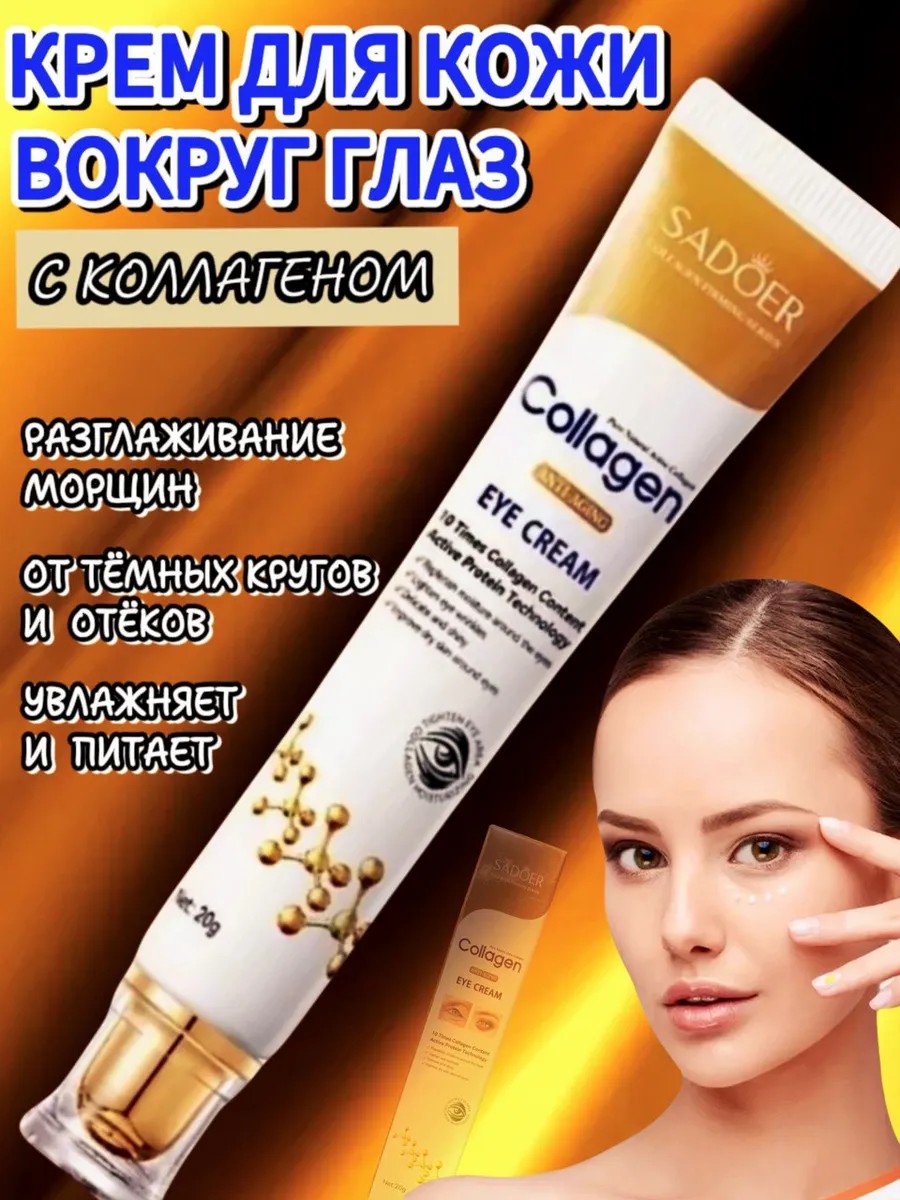 SADOER Collagen Eye Cream is a professional cosmetic product. It possesses unique properties that will help preserve the youth and beauty of your skin. The cream is enriched with collagen, a key component of the skin responsible for its firmness and elasticity. Collagen promotes active hydration, improves tone, and protects the skin from dryness. The cream is also enriched with hyaluronic acid, which penetrates deep into the skin, retains moisture, and improves hydration. It moisturizes and nourishes the delicate skin of the eyelids and face, eliminating puffiness and dark circles, leaving the look fresh and rested, and provides a lifting effect. This natural skincare product also helps reduce age-related expression lines and prevents their appearance. This nourishing, restorative anti-aging cream applies easily to the skin and absorbs quickly without leaving a greasy residue. Ideal for daily use, morning and evening, it is suitable for both men and women and for all skin types, including oily, dry, and mature. The cream has a comprehensive effect: it maintains moisture balance, stimulates collagen and hyaluronic acid synthesis, accelerates regeneration processes, and brightens skin tone. With regular use, it smooths and firms the skin. This eye cream has a rich texture and is quickly absorbed. Recommended for anti-aging care. It contains marine collagen, which stimulates the synthesis of collagen and protects it from destruction. A complex of three peptides stimulates collagen production, reduces wrinkles, smoothes and evens them out, and reduces the appearance of puffiness thanks to its drainage effect. Squalane effectively softens and soothes the skin around the eyes, rejuvenating it. Ectoine and vitamin E improve and enhance protective functions and promote rapid cell regeneration. The result: elastic and hydrated skin around the eyelids, with less visible wrinkles. This is an excellent choice for those who want to maintain youth and beauty.
