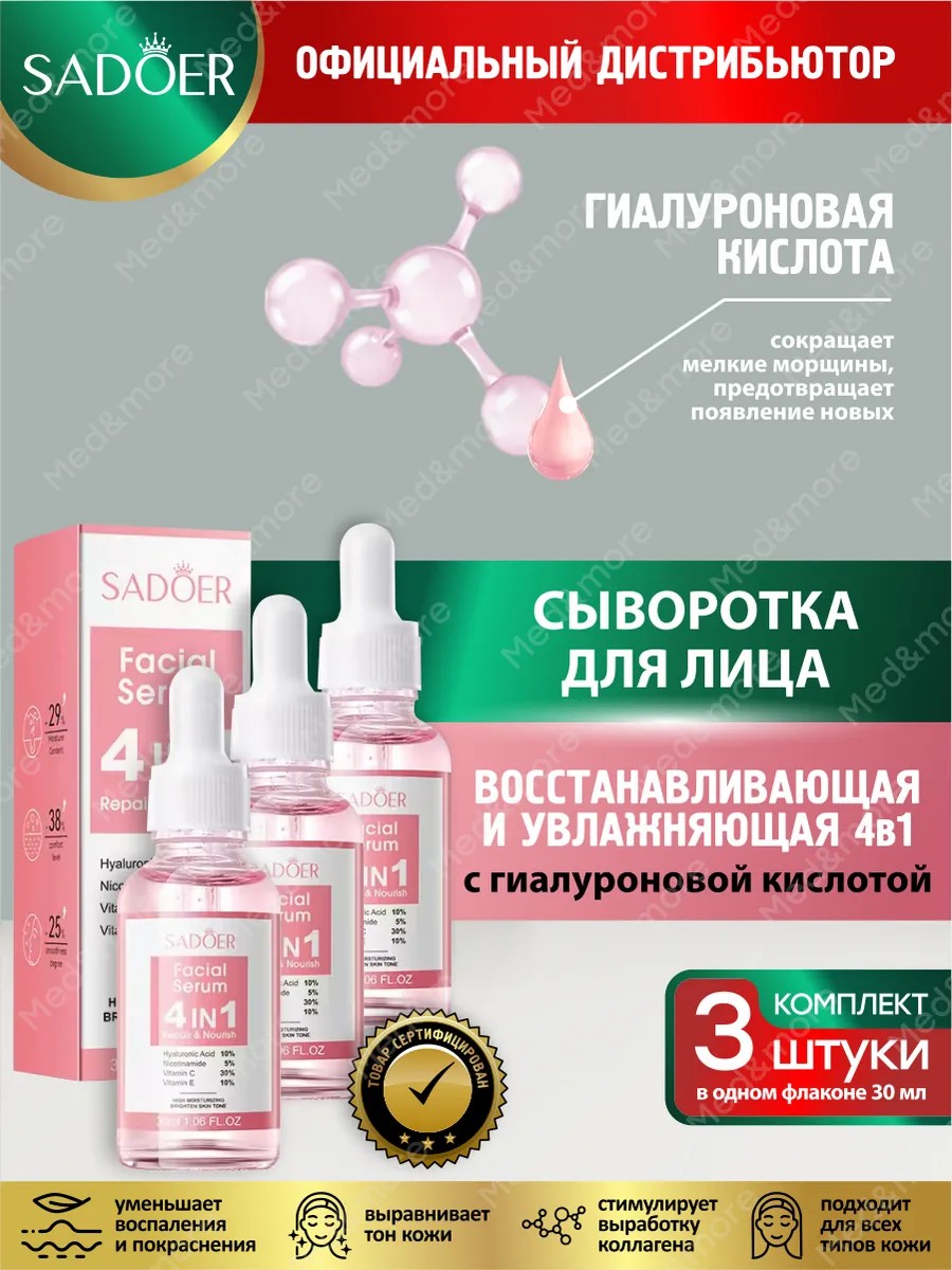 Восстанавливающая сыворотка для лица 4в1 Sadoer с гиалуроновой кислотой 30 мл. х 3 шт. - это инновационное решение для комплексного ухода за кожей, которое эффективно справляется с проблемами увядания и дефицита влаги. Благодаря уникальной формуле, она сочетает в себе четыре ключевых действия: увлажнение, восстановление, питание и защиту.