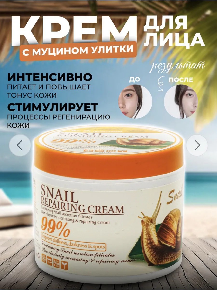 Snail Repairing Cream 99% provides a comprehensive rejuvenating, firming, and restorative effect. Snail mucin is used for deep hydration, activating natural regeneration mechanisms, providing a lifting effect, nourishing, super-hydrating, and restoring firmness and elasticity. The natural formula provides comprehensive anti-aging facial care, activates cell renewal, prevents the formation of deep wrinkles, promotes rejuvenation, gently brightens, firms, and stimulates the production of natural collagen and elastin. Cosmetics with snail mucin are a unique product that provides a nourishing and soothing effect, while being perfectly accepted by human skin as a natural substance. It has an antimicrobial effect, protects against free radicals, and removes toxins. A complex of vitamins in the formula prevents dryness and flaking, restoring the protective properties of the epidermis. This Korean face cream protects skin from aggressive environmental influences and can be used as a hand cream. It has a light texture that absorbs instantly without leaving a sticky or greasy feeling. Suitable for both women and men, and for all skin types: normal, combination, dry, problematic, and mature. It is completely hypoallergenic. Directions: Apply a small amount to the face, including the neck, and wait until completely absorbed. Use in the morning as a day cream or in the evening as a night cream. With daily use, skin tone is evened out, redness, inflammation, and pigmentation are reduced, and a fresh, velvety feel appears. Asian organic cosmetics (Korean and Chinese) contain the most effective ingredients for maintaining beauty and youth.