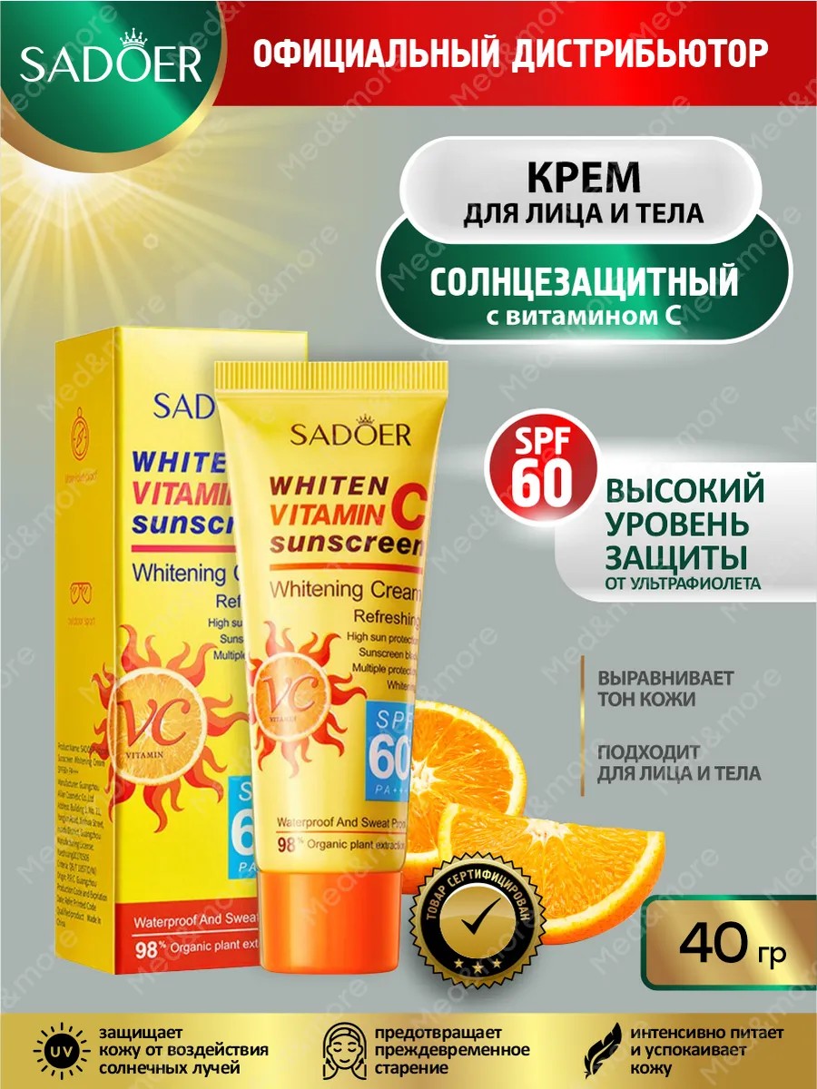 Full name of the productBrightening sunscreen for face and body SPF60+ PA+++ Sadoer with vitamin C 40 g
