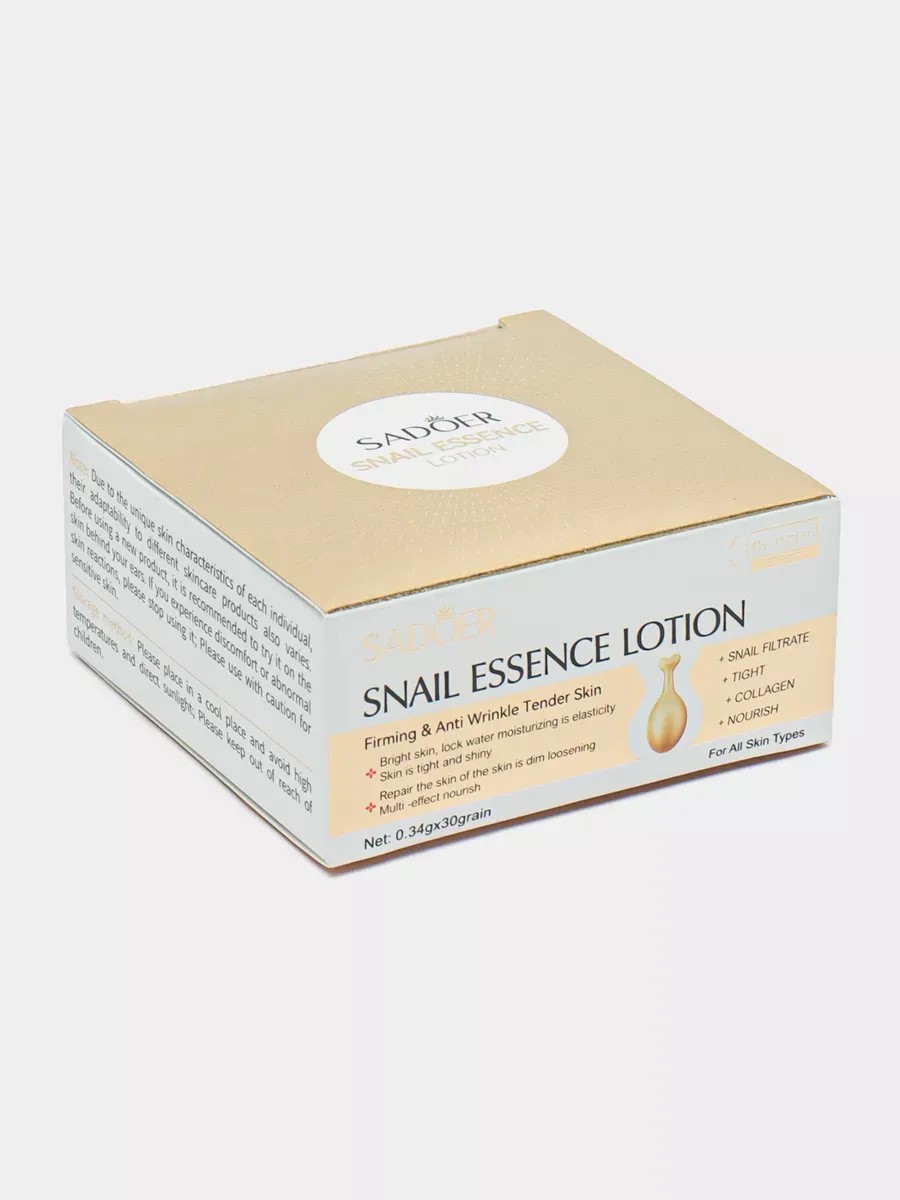 Introducing an innovative snail mucin capsule face cream from Sadoer. This anti-aging cream-essence has a unique formula enriched with over 90% active ingredients, including hyaluronic acid, collagen, niacinamide, and vitamin E. Each capsule contains a powerful complex specially designed for women of all ages and skin types. The gel-cream is easily absorbed without leaving a greasy film, making it ideal for dry, oily, and combination skin. The essence effectively combats signs of aging, smoothing wrinkles and firming the skin. Furthermore, the cream provides protection from harmful environmental factors. This restorative Chinese cream moisturizes without a mask effect. The nighttime collagen formula allows the skin to recover and regenerate while you sleep, while the daytime version provides a subtle glow and evens out skin tone before applying makeup. This product is also ideal for problem skin, helping to combat the appearance of post-acne marks and reduce inflammation. This rejuvenating cream can be used as a base for decorative cosmetics. After cleansing, easily open the capsule and apply the contents to the face, neck, and eye area, providing reliable care and nourishment. APPLICATION: Cut off the capsule's "tail" and squeeze the contents onto the back of your hand. Apply to the face with light patting movements. Do not rinse. Use 1 capsule daily, at approximately the same time each day for maximum effect. This silicon-containing cream can be applied to the entire face, décolleté, and under-eye area. With Sadoer, your skin will appreciate the hyaluronic gel for firmness and radiance, which provides a toned and defined facial contour. Discover Chinese skincare products for perfect skin, created using advanced Korean cosmetology technologies, and stay young and beautiful every day!