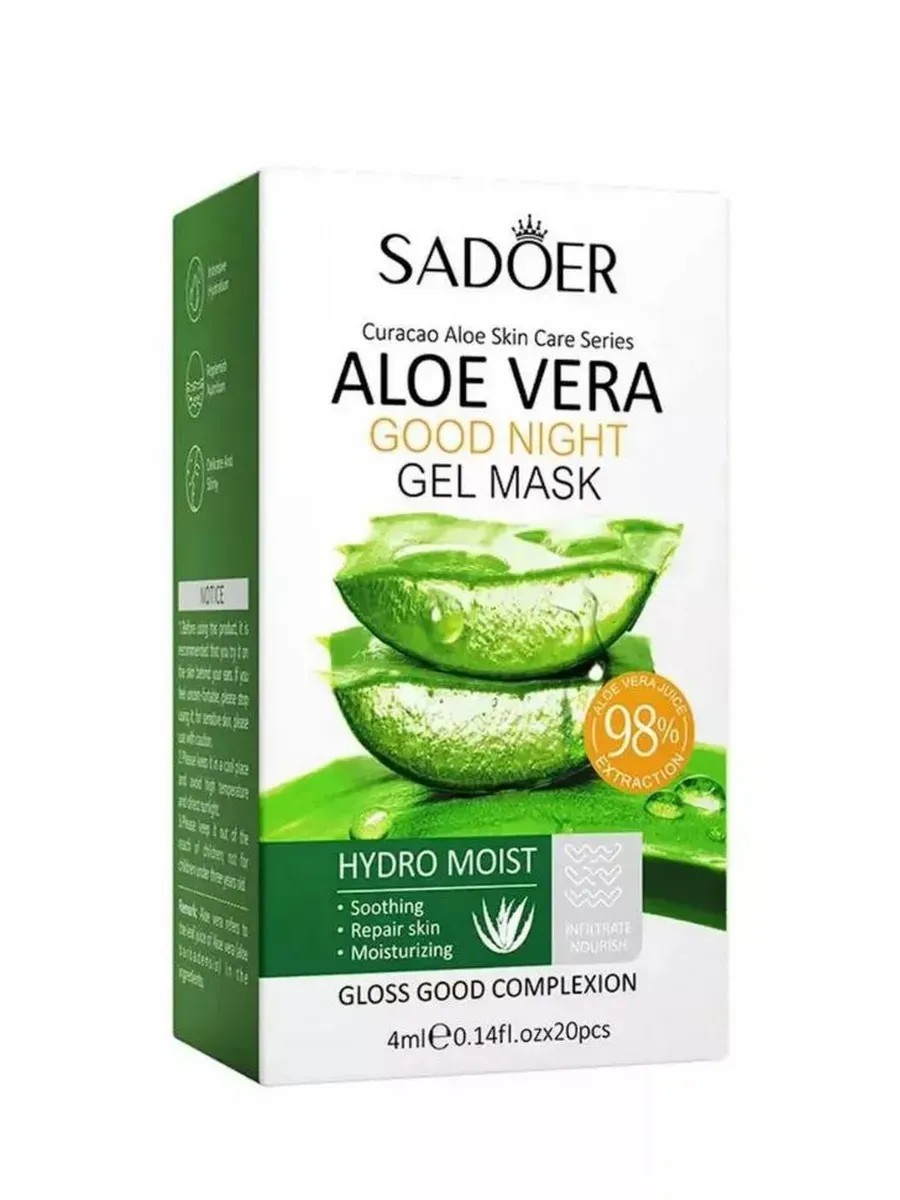 Набор увлажняющих масок для лица, шеи и декольте Sadoer состоит из 20 стиков по 4 мл. Ночная несмываемая гель маска с алоэ вера без активного аромата, питает и восстанавливает кожу во время сна, имеет накопительный эффект, восполняя запасы питательных веществ. Ее гелеобразная прозрачная консистенция имеет освежающую и нелипкую текстуру, легко впитывается, не стягивает кожу и не образует пленки, сужает поры, помогает избавиться от следов акне. Благодаря увлажняющим свойствам и легкой текстуре кожа становится бархатистой, нежной и эластичной. Этот косметический набор в индивидуальных саше удобно брать с собой в дорогу и использовать в качестве экспресс маски. В составе омолаживающего средства содержатся такие активные компоненты как сок алоэ, аллантоин, касторовое масло, пропиленгликоль. Алоэ вера очищает и освежает кожу, разглаживает мелкие мимические морщинки. Аллантоин стимулирует процесс регенерации клеток кожи, снимает воспаление и раздражение. Пропиленгликоль эффективно удерживает влагу в коже. Касторовое масло хорошо увлажняет, смягчает и питает кожу любого типа. Нежная формула восстанавливающего средства подходит для всех типов кожи ( проблемной, сухой, жирной, нормальной, комбинированной), включая увядающую, и для любого возраста начиная с 18 лет. Может использоваться как женщинами, так и мужчинами. Она улучшает внешний вид, устраняет симптомы обезвоживания, улучшает цвет лица. При регулярном применении антивозрастная маска предупреждает появление сухости, борется с несовершенствами кожи, делая ее более подтянутой и ухоженной.