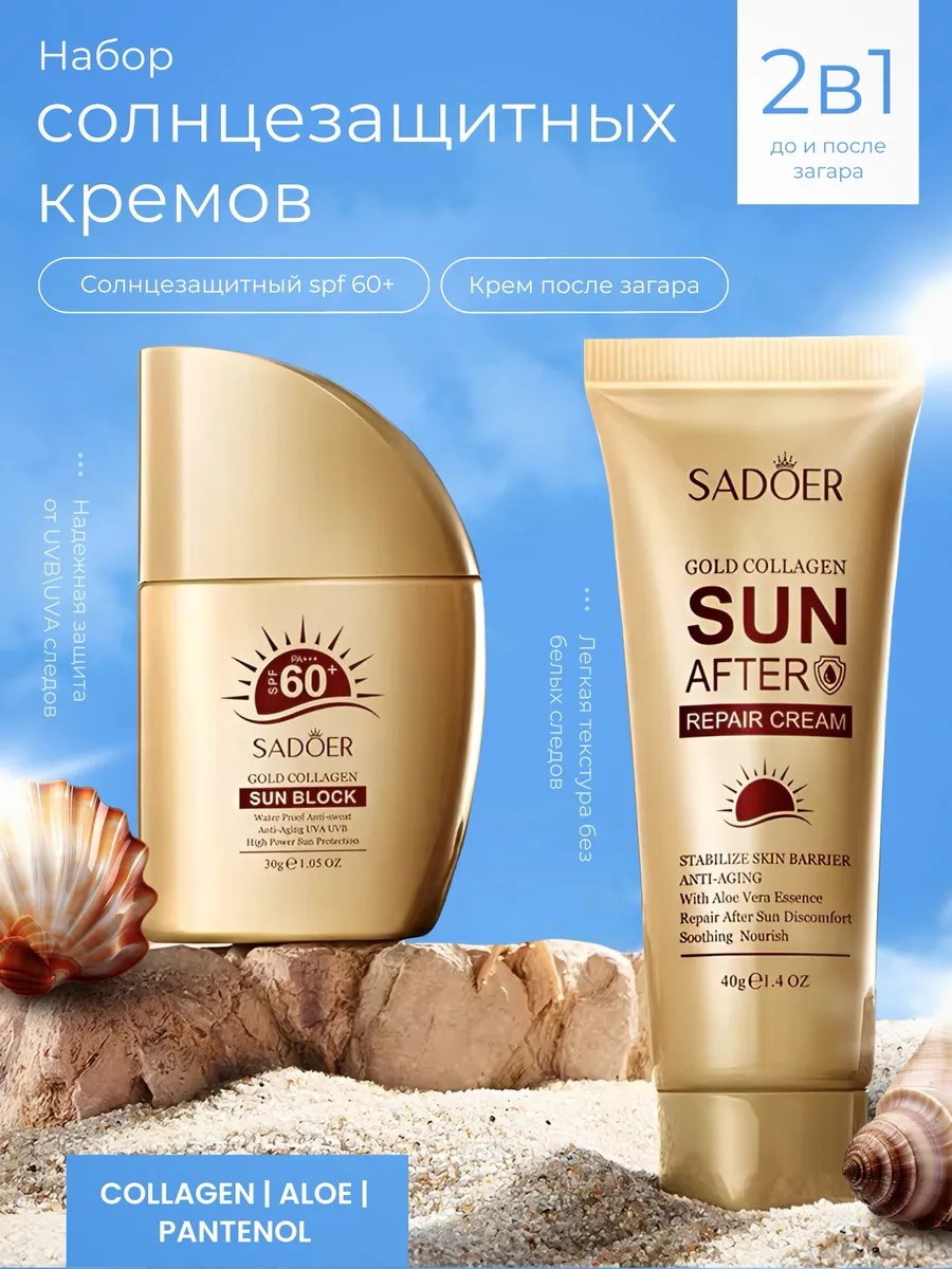 Идеальное средство для вашей кожи в летний период на отдыхе на пляже это солнцезащитный набор 2в1 в который входит солцезащитный крем для лица и тела 60+ водостойкий и восстанавливающий крем после загара.