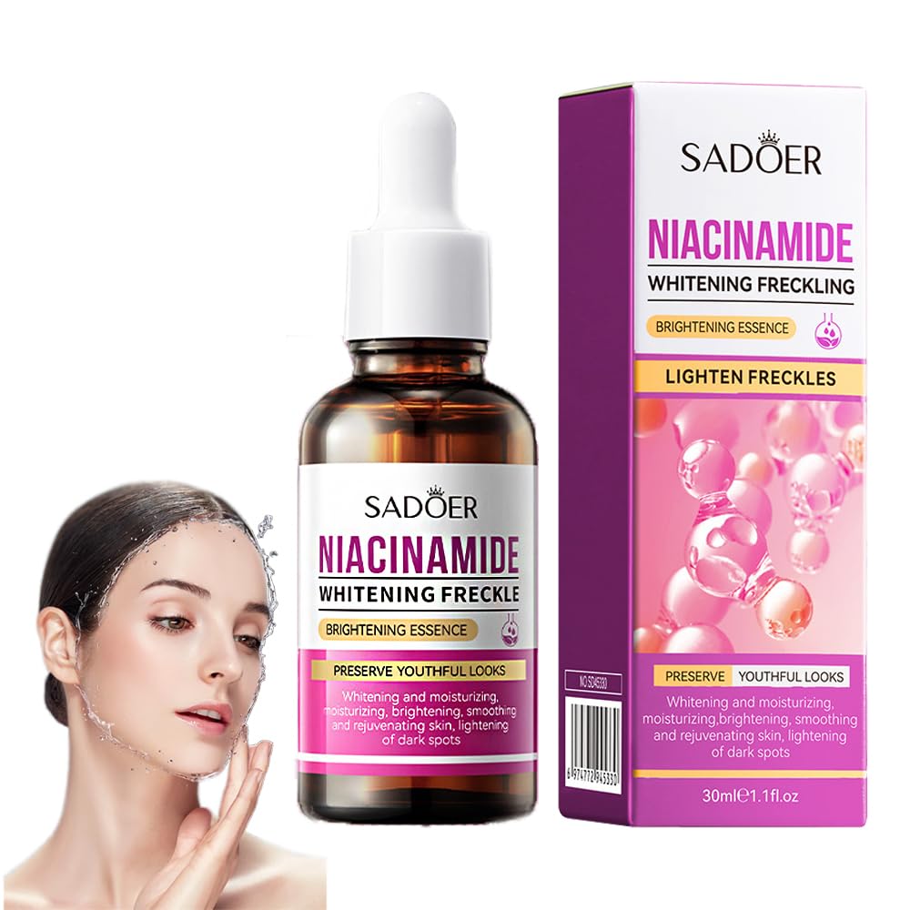 Transform your skincare routine with this powerful Niacinamide Whitening Facial Serum. This 30ml brightening essence combines the potent benefits of niacinamide and hyaluronic acid to effectively target multiple skin concerns. The advanced formula works diligently to lighten dark spots and even skin tone while providing deep hydration. Enhanced with glycerin and carbomer, this serum helps improve skin texture, minimize the appearance of pores, and maintain the skin's moisture balance. The lightweight essence absorbs quickly, making it perfect for daily use, morning and night. This concentrated formula helps combat dullness, treat uneven skin tone, and promote a brighter, more radiant complexion. The serum's hydrating properties help maintain youthful appearance and skin elasticity, leaving skin smooth and supple. Suitable for various skin types, this serum offers a complete solution for those seeking a brighter, more refined complexion. INDICATIONS Dark spots SAFETY WARNING Keep out of reach of children. See moreEasy application: Lightweight texture that absorbs quickly into the skin, suitable for daily use in your skincare routine. Skin concerns: Specially formulated to address multiple concerns, including dark spots, dryness, and uneven texture. Multi-benefit solution: Combines hydrating, firming, and skin-firming properties in a concentrated 30ml serum. Brightening formula: The advanced whitening essence helps improve the appearance of dull skin and promotes a more radiant complexion. Powerful ingredients: Contains niacinamide and hyaluronic acid to target dark spots and uneven skin tone while providing deep hydration.SADOER Sérum blanchissant pour le visage à la niacinamide – Essence éclaircissante à l'acide hyaluronique pour les taches sombres 30 mlDESCRIPTION DU PRODUIT DESCRIPTION DU PRODUIT Transformez votre routine de soins de la peau avec ce puissant sérum blanchissant pour le visage à la niacinamide. Cette essence éclaircissante de 30 ml combine les puissants avantages de la niacinamide et de l'acide hyaluronique pour cibler efficacement plusieurs problèmes de peau. La formule avancée fonctionne avec diligence pour éclaircir les taches sombres et unifier le teint de la peau tout en fournissant une hydratation profonde. Amélioré avec de la glycérine et du carbomère, ce sérum aide à améliorer la texture de la peau, à réduire l'apparence des pores et à maintenir l'équilibre hydrique de la peau. L'essence légère absorbe rapidement, ce qui la rend parfaite pour un usage quotidien le matin et le soir. Cette formule concentrée aide à lutter contre la peau terne, à traiter les taches inégales tout en favorisant un teint plus lumineux et plus éclatant. Les propriétés hydratantes du sérum aident à maintenir l'apparence jeune et l'élasticité de la peau, la laissant lisse et souple. Convient à différents types de peau, ce sérum offre une solution complète pour ceux qui cherchent à obtenir un teint plus lumineux et raffiné. INDICATIONS Taches sombres AVERTISSEMENT DE SÉCURITÉ Tenir hors de portée des enfants. Voir plusApplication facile : texture légère qui pénètre rapidement dans la peau, adaptée pour un usage quotidien dans votre routine de soins de la peau. Préoccupations pour la peau : spécialement formulé pour traiter plusieurs problèmes, y compris les taches sombres, la sécheresse et la texture inégale. Solution multi-avantages : combine des propriétés hydratantes, raffermissantes et raffermissantes pour la peau dans un sérum concentré de 30 ml. Formule éclaircissante : l'essence blanchissante avancée aide à améliorer l'apparence de la peau terne et favorise un teint plus éclatant. Ingrédients puissants : contient de la niacinamide et de l'acide hyaluronique pour cibler les taches sombres et le teint inégal de la peau tout en fournissant une hydratation profonde.