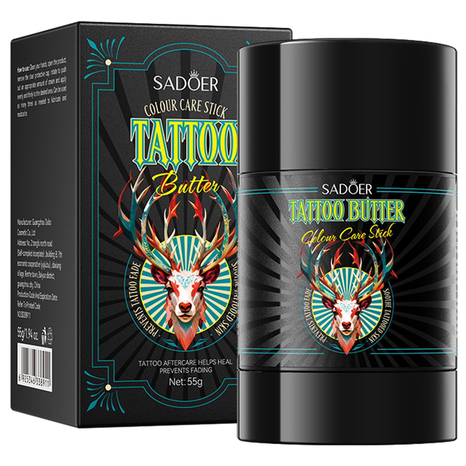 : Tattoo healing cream in a 55g stick, combining hydration, nourishment, and healing support for vibrant colors. Safety Warning: For external use only. Avoid contact with eyes. Keep away from flames or heat sources.Fast absorption, no greasy residue – non-greasy tattoo lotion type, penetrates in seconds. Long-lasting moisturizing tattoo care – provides 24-hour comfort and suppleness thanks to a lotion specifically designed for moisturizing tattoo care. Tattoo healing support – soothing texture that promotes tattoo healing after the session. Intensive nourishing, tattoo balm type – enriched with aloe vera, shea butter, and argan oil for deep tattoo balm. Targeted hydration with tattoo aftercare cream – enriched formula for intensive tattoo aftercare. On-the-go stick format for aftercare – compact stick design for quick and mess-free aftercare.Description du produit Crème cicatrisante tatouage en stick 55 g combinant hydratation, nutrition et soutien de la cicatrisation pour des couleurs éclatantes. Avertissement De Sûreté Usage externe uniquement. Éviter tout contact avec les yeux. Tenir éloigné de toute flamme ou source de chaleur.Absorption rapide, sans film gras – type lotion tatouage non grasse, pénètre en quelques secondes. Soin tatouage hydratant longue durée – apporte confort et souplesse 24 h grâce à une lotion spécifiquement conçue pour le soin tatouage hydratant. Soutien de la cicatrisation tatouage – texture apaisante qui favorise la cicatrisation tatouage après séance. Nourrissant intensif, type baume tatouage – enrichi en aloe vera, beurre de karité et argan pour un baume tatouage profond. Hydratation ciblée avec crème de soin pour tatouage – formule enrichie pour un crème de soin pour tatouage intensif. Format stick nomade pour soin après tatouage – design compact en stick pour un soin après tatouage rapide et sans gâchis.SADOER Stick Corporel Soin Couleur Tatouage – Baume Hydratant Nourrissant Apaisant, Format Pratique 55g
