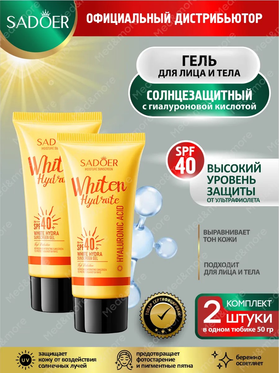 | Полное наименование товара | Комплект Увлажняющий солнцезащитный гель SPF40+PA+++ Sadoer с гиалуроновой кислотой 50 гр х 2 шт. |