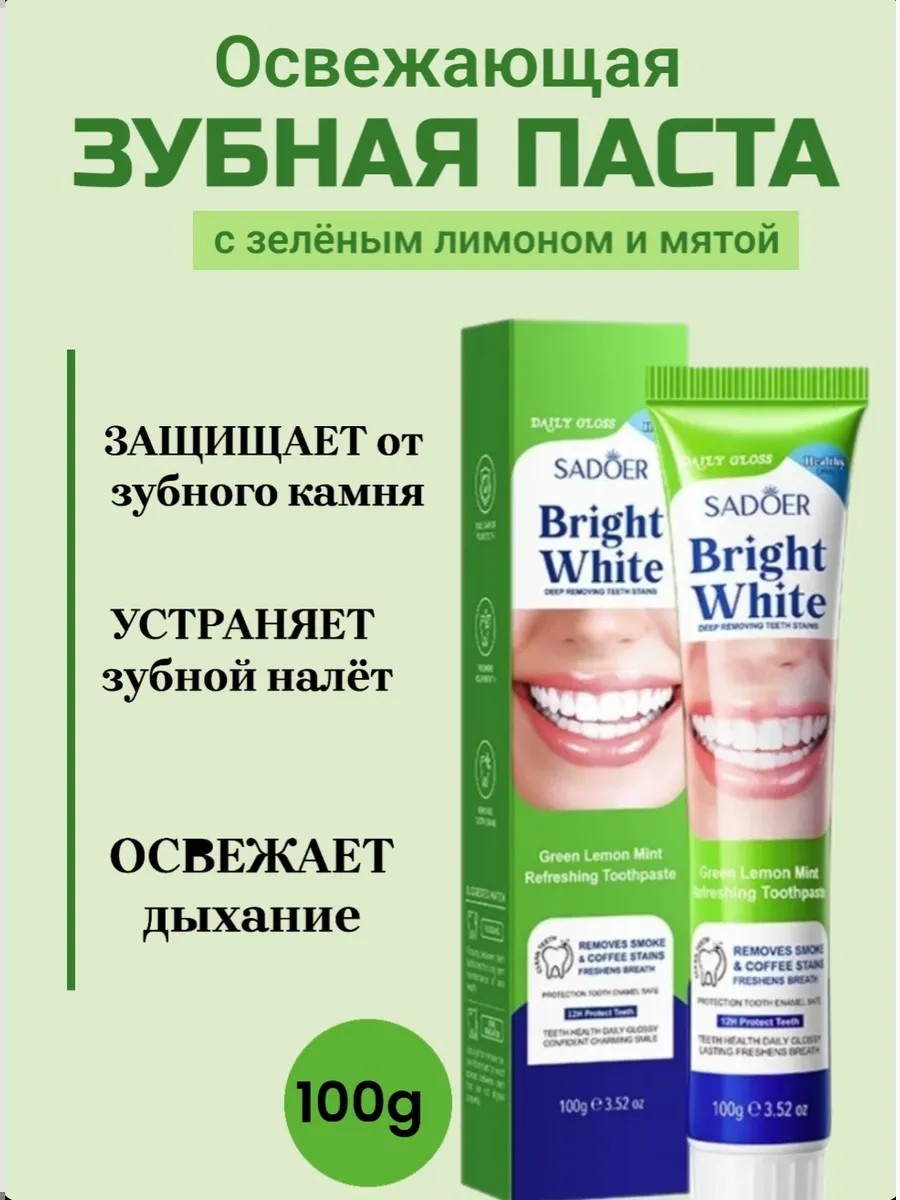 | Состав | зубная паста; сода; Отбеливающая; с зеленым лимоном и мятой |